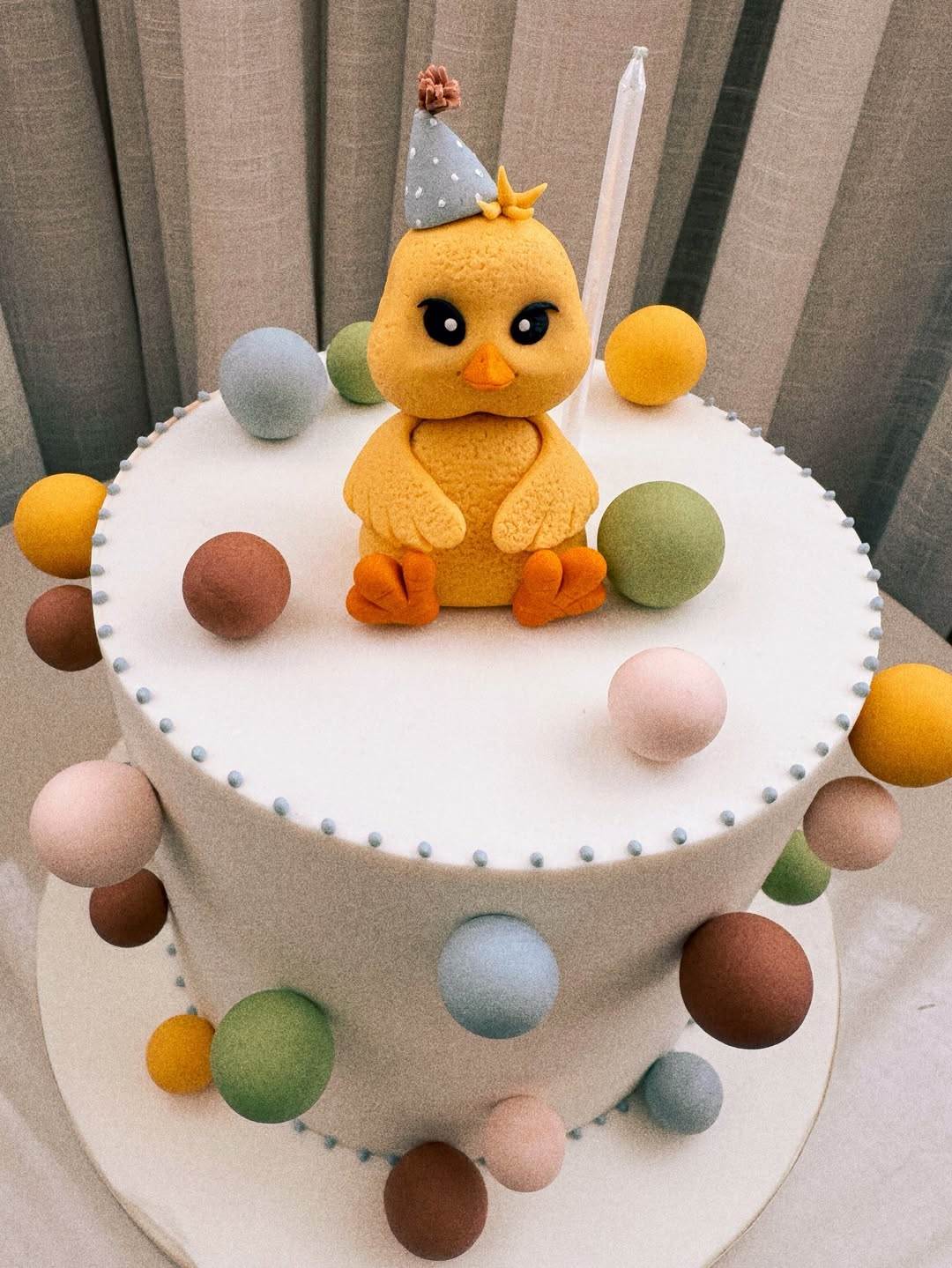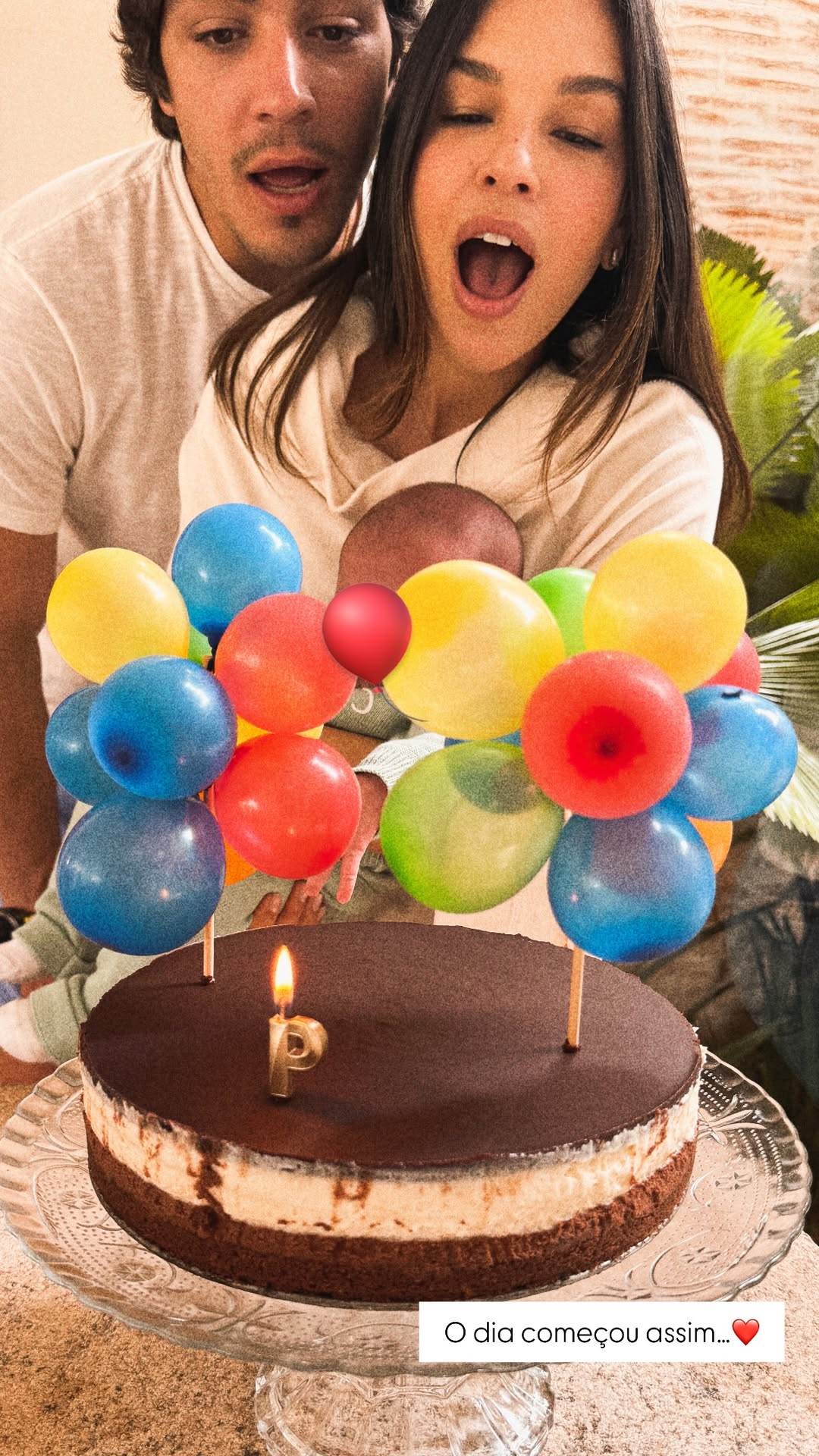 Em comemoração à data especial, Mariana organizou uma festinha intimista em casa, com direito a um bolo decorado com balões coloridos e uma vela com a inicial do bebê.