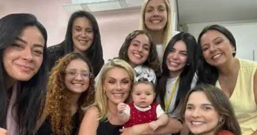Na imagem, além da famosa, sua irmã Fernanda Hickmann e outras funcionárias aparecem reunidas em um momento de pura ternura no ambiente profissional.