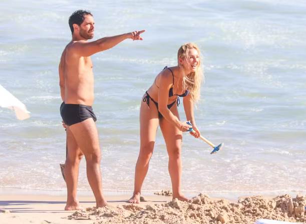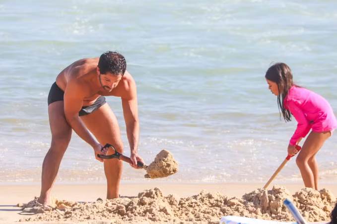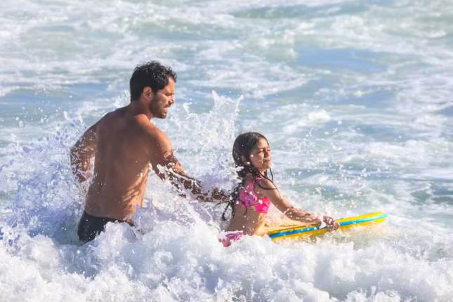 O casal curtiu o final de semana com a pequena na praia do Rio de Janeiro também. Duda foi clicado ensinando a filha a surfar e aproveitando o calorão carioca. Momentos depois, a namorada, o ator e a enteada foram vistos brincando juntos na areia.