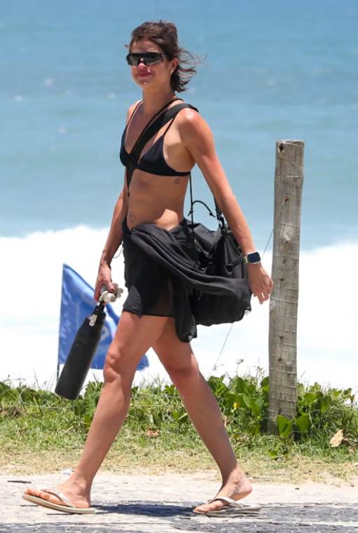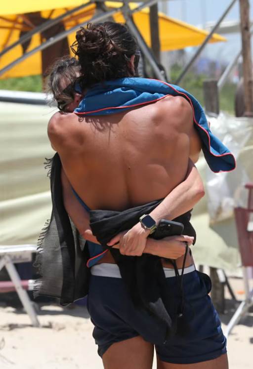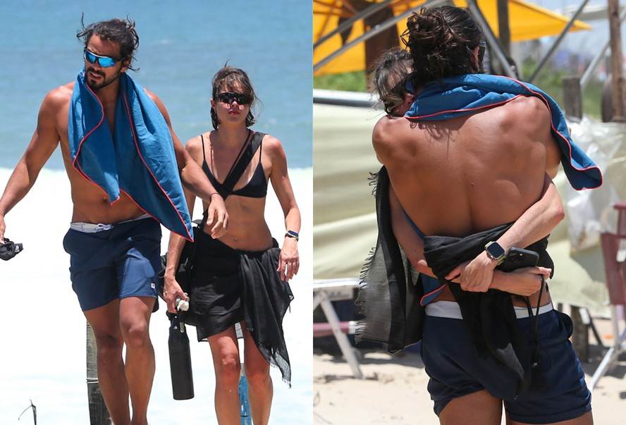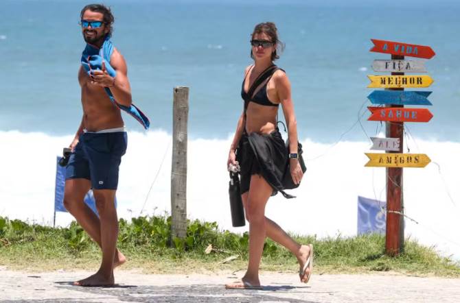 Já Rodrigoescolheu um short azul-marinho com detalhes em branco. Os dois completaram o visual com óculos de sol estilosos para aproveitar a manhã em clima de romance, entre um mergulho no mar e outro.