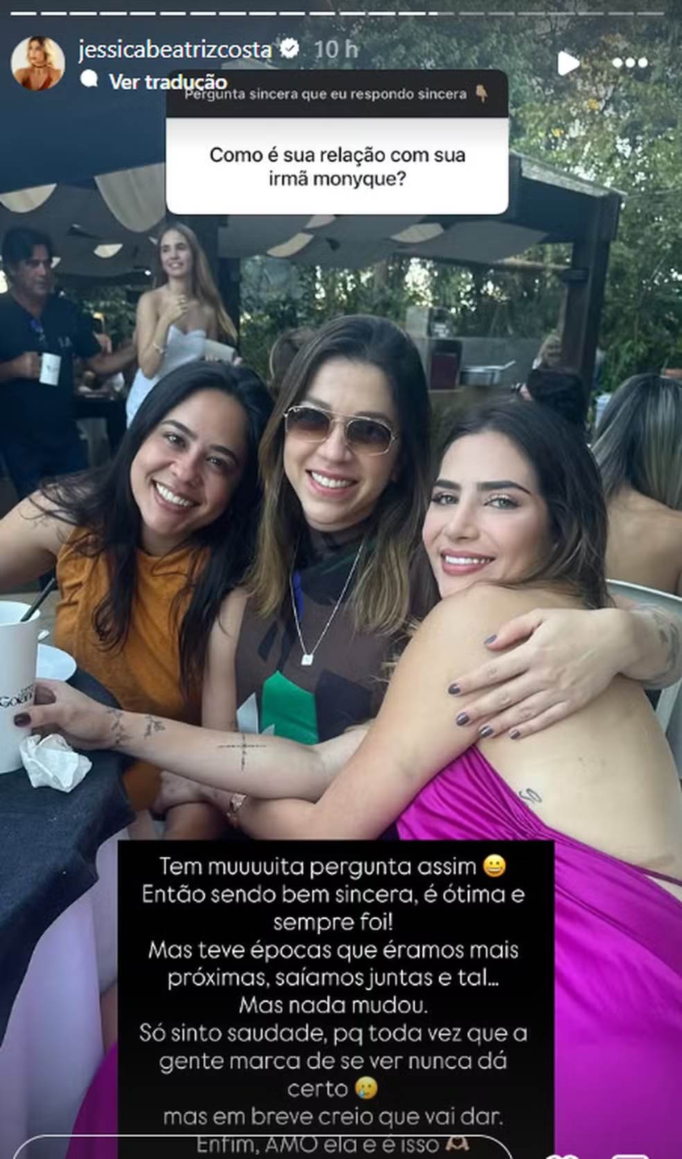 A influenciadora digital Jéssica Beatriz Costa, que é filha do cantor Leonardo, contou como é sua relação com a irmã Monyque Isabella, que também é herdeira do sertanejo. Em uma interação com os fãs nas redes sociais, ela esbanjou sinceridade em sua resposta sobre a irmã.