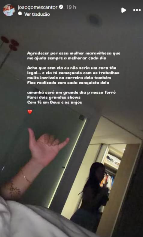 "Agradecer por essa mulher maravilhosa que me ajuda sempre a melhorar cada dia. Acho que sem ela eu não seria um cara tão legal… e ela tá começando com os trabalhos muito incríveis na carreira dela também", afirmou o famoso em seus stories.