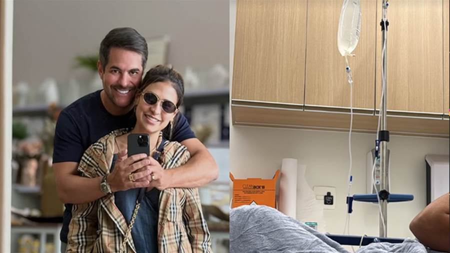Pouco depois, ela exibiu que já estava no hospital recebendo medicação na veia e fez uma brincadeira ao dizer que o marido seguia ao seu lado “na saúde e na doença”.