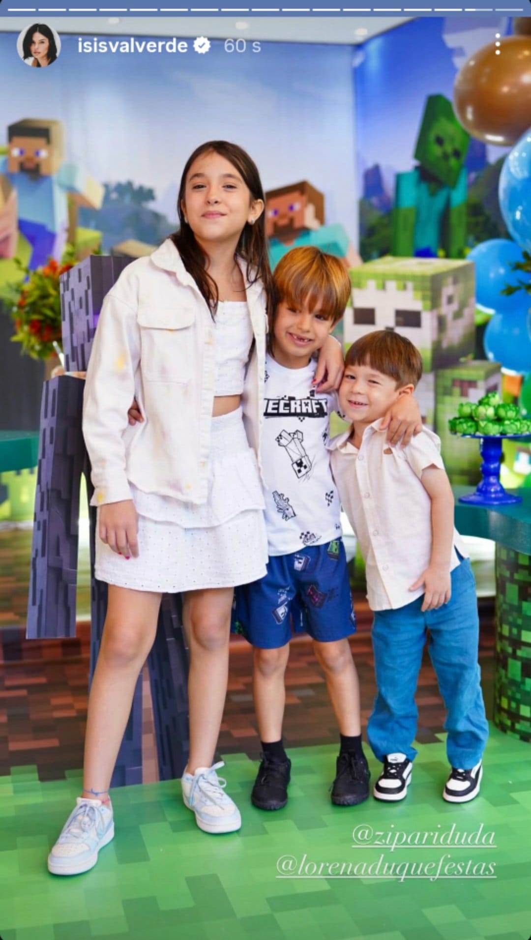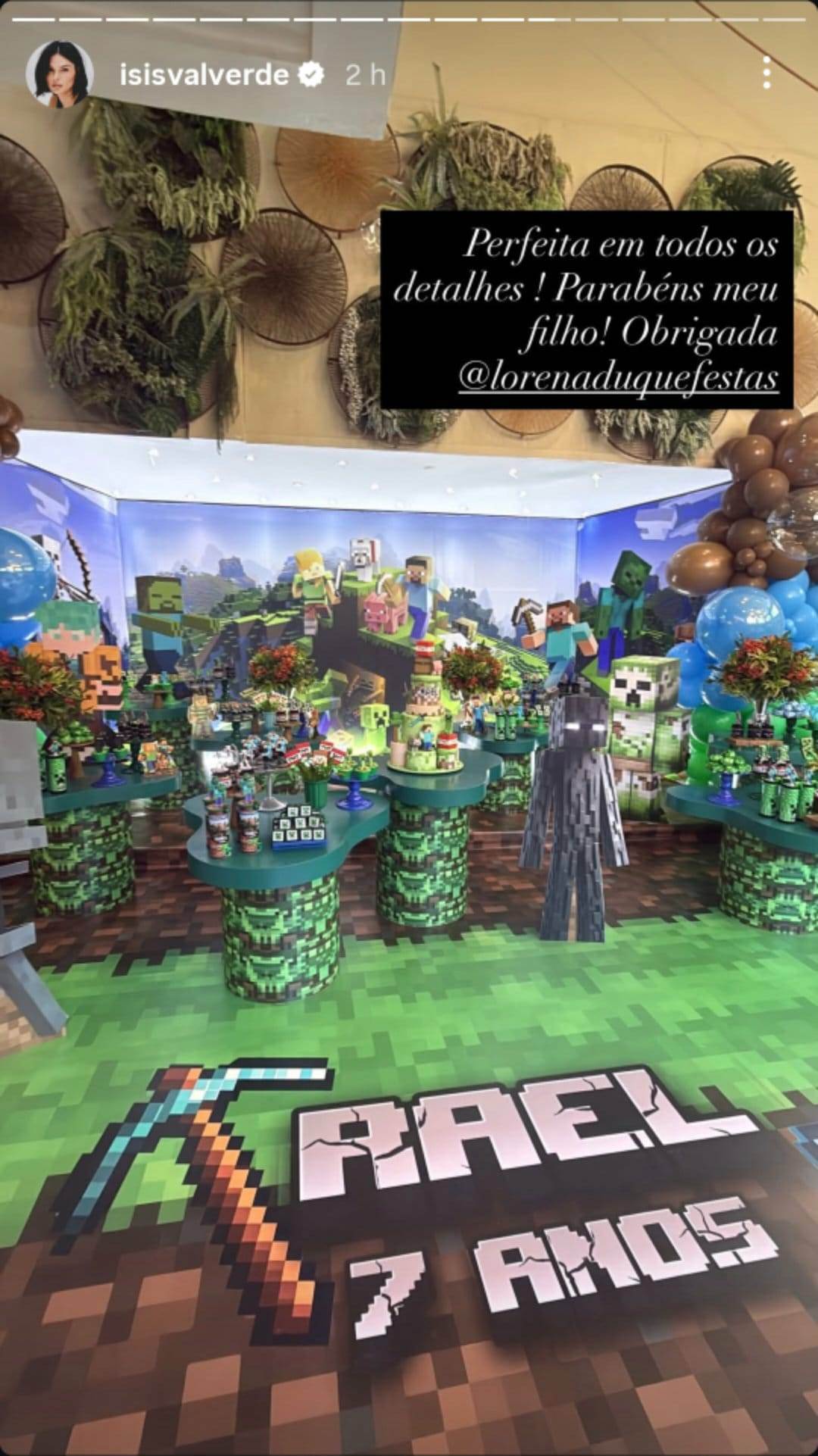 No chão, o nome de Rael foi gravado e o aniversariante apareceu usando um look inspirado no jogo eletrônico. Isis Valverde postou algumas fotos da festa e apareceu em um clique ao lado do filho.