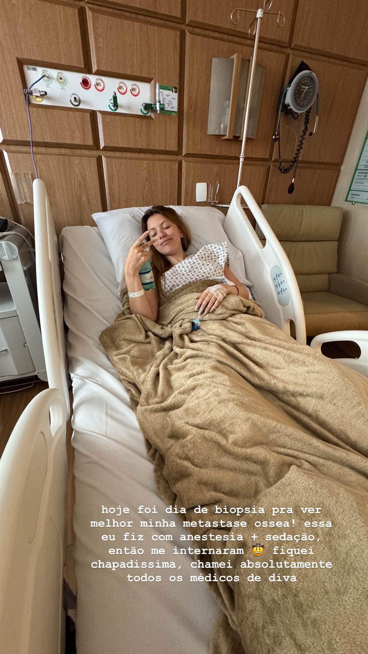"Hoje foi dia de biopsia para ver melhor minha metastase ossea! Essa eu fiz com anestesia + sedação, então me internaram. Fiquei chapadissima, chamei absolutamente todos os medicos de diva!", compartilhou.