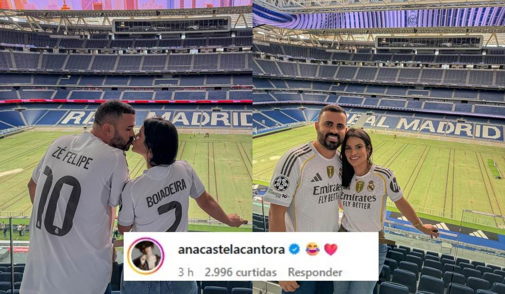 Em uma publicação nas redes sociais, o casal posou na arquibancada se beijando de costas, exibindo as camisas temáticas. A postagem rapidamente repercutiu, e Ana Castela reagiu com bom humor, adicionando um emoji de riso e um coração vermelho nos comentários. Zé Felipe também interagiu, deixando uma curtida na publicação.