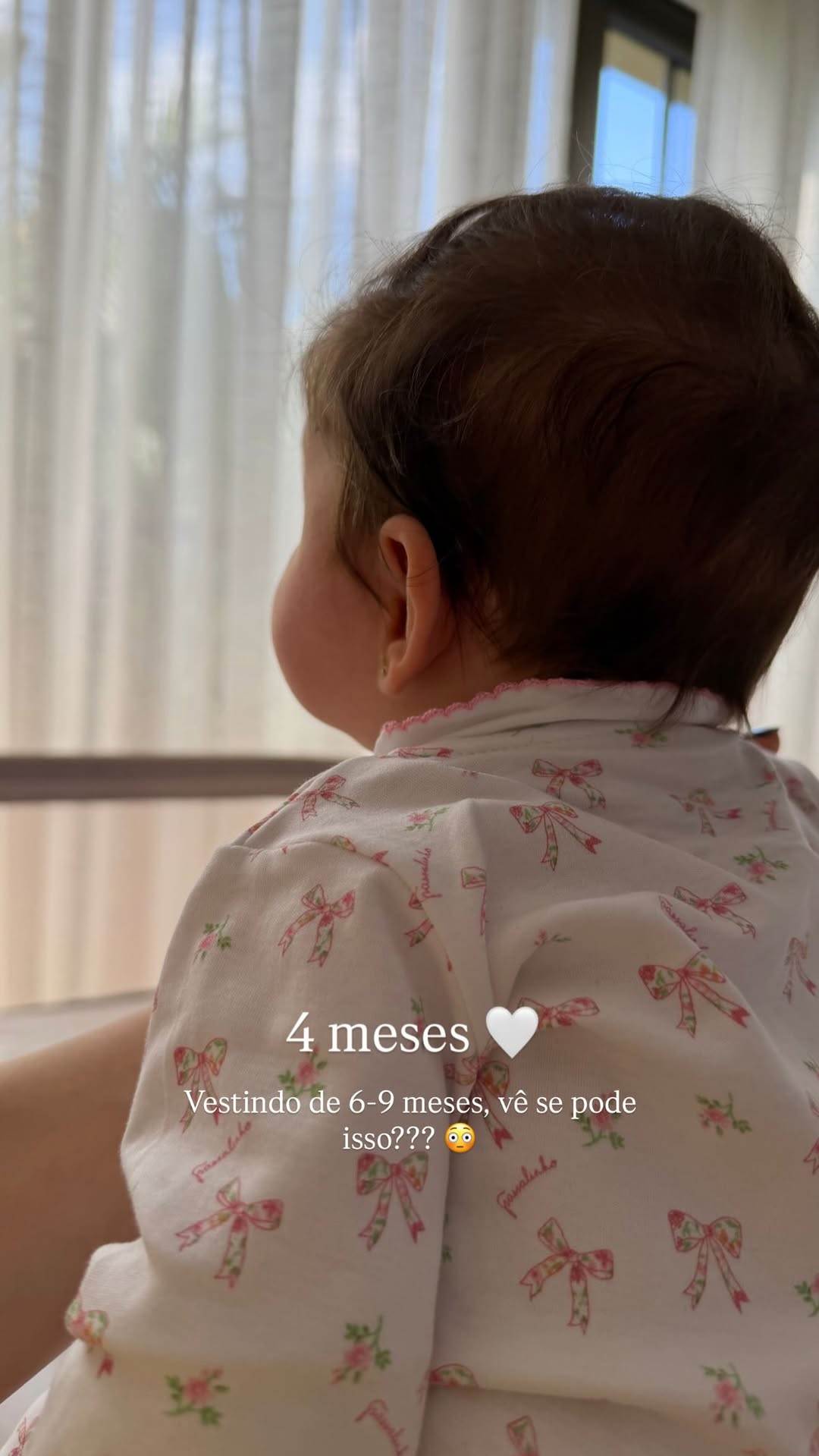 Na imagem compartilhada nas redes sociais, Clara aparece de costas, usando um adorável vestido branco com estampa de laços. No entanto, o que mais chamou atenção dos fãs não foi só o look, mas também a aparência da bebê. Com cabelos cheios e um jeitinho esperto, Clara já promete ser tão carismática quanto os pais. “Gente, ela tá enorme! Tá usando vestido de 6-9 meses com só 4 meses.