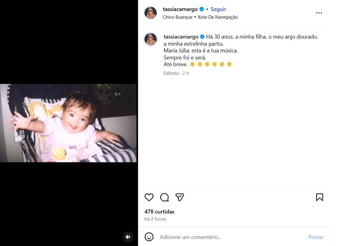 A atriz Tássia Camargo usou as redes sociais para prestar uma homenagem emocionante à filha, Maria Júlia. A menina faleceu em 1996, quando tinha apenas dois anos de idade, em decorrência de complicações da rubéola.