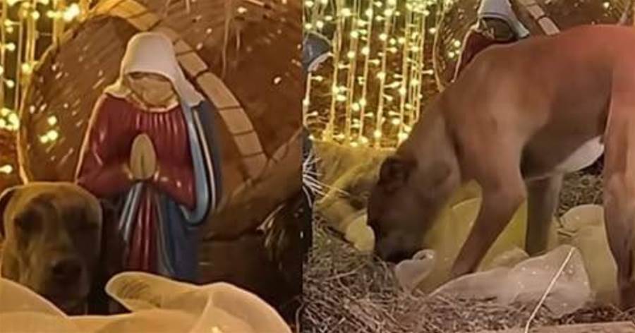 Os clássicos cachorros caramelos do Brasil, sempre à procura de um abrigo contra a solidão e o frio, foram atraídos pela suave palha da manjedoura e pelo calor aconchegante das luzes do presépio.