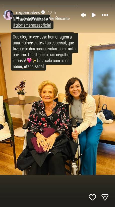 E o encontro não foi por acaso. Na legenda, Regiane contou que o edifício em que as duas residem prestou uma homenagem especial à veterana, nomeando uma sala do local com seu nome.