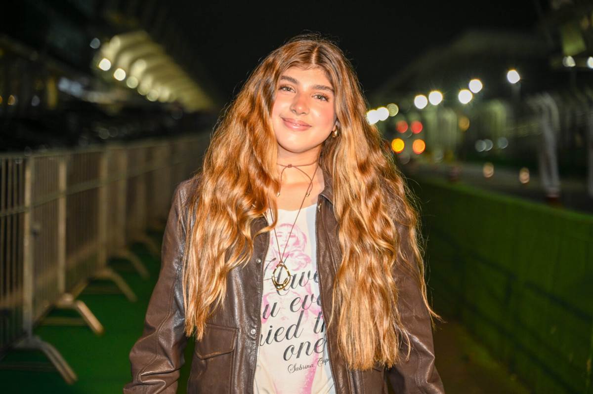 A jovem, de 13 anos, que já mede cerca de 1,73m mesmo com pouca idade, apostou em uma produção alinhada ao clima do festival. Para a ocasião, Sofia escolheu um short com estampa animal print, combinado com jaqueta de couro em tom escuro e uma camiseta estampada da cantora