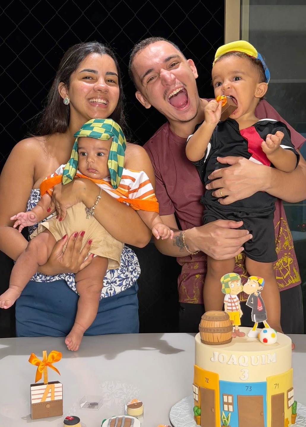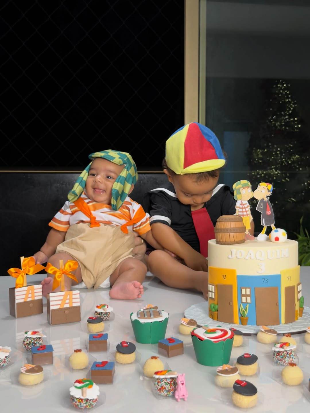 Joaquim e o irmão, Jorge, primogênito do casal, ainda surgiram fantasiados com roupas do Chaves e Kiko.