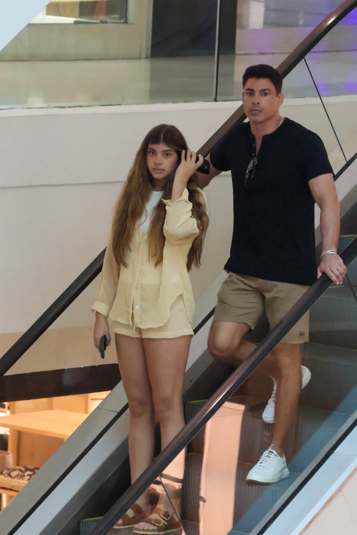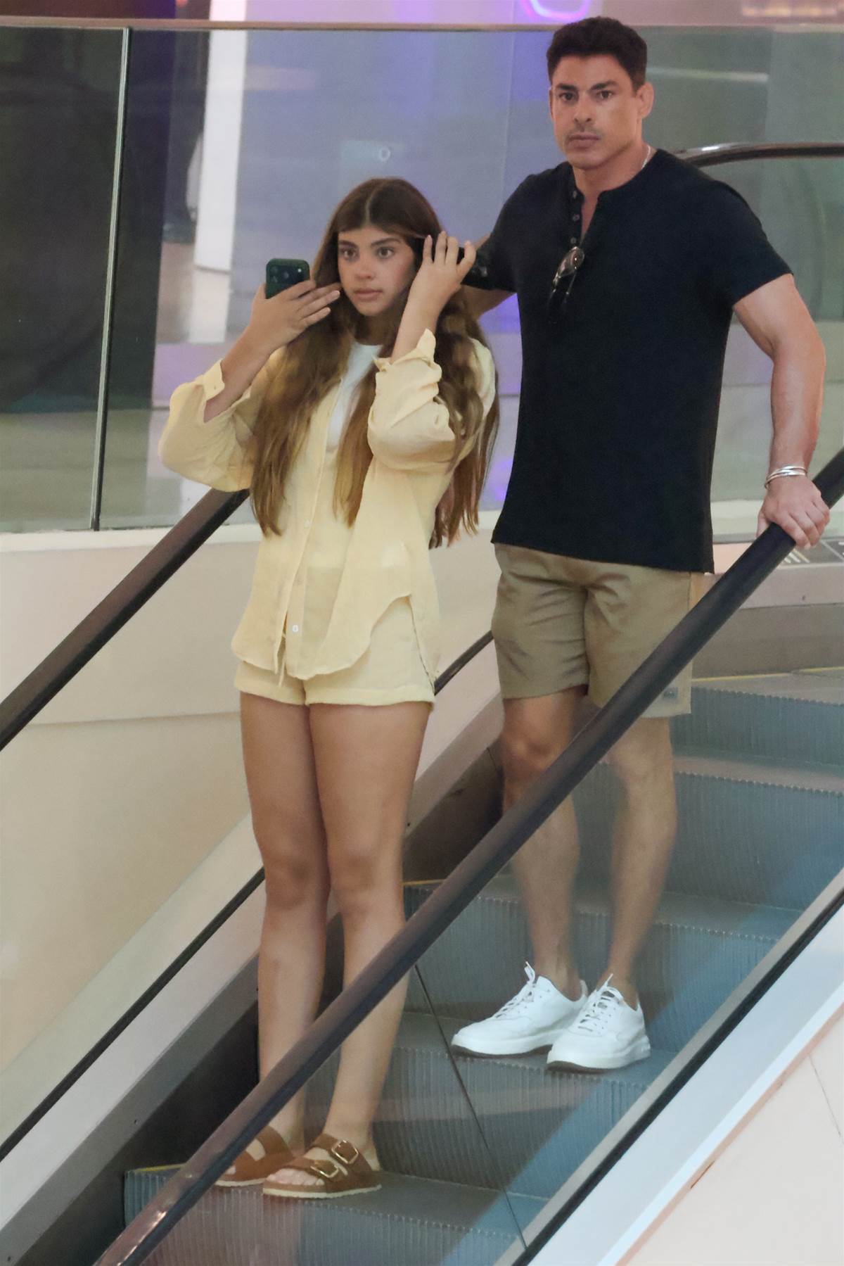 Com o cabelo natural e sem maquiagem, ela surgiu ao lado do pai mexendo no celular e vestindo um conjuntinho amarelo com sandálias modelo papete. O galã também apostou em uma roupa básica e confortável para as compras com a filha.
