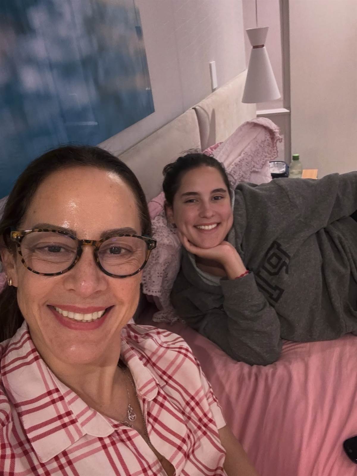 No registro, Silvia e a herdeira mais nova aparecem vestindo roupas confortáveis para curtirem uma noite de filmes. Esbanjando alegria, as duas não pouparam sorrisos ao posarem para a selfie.