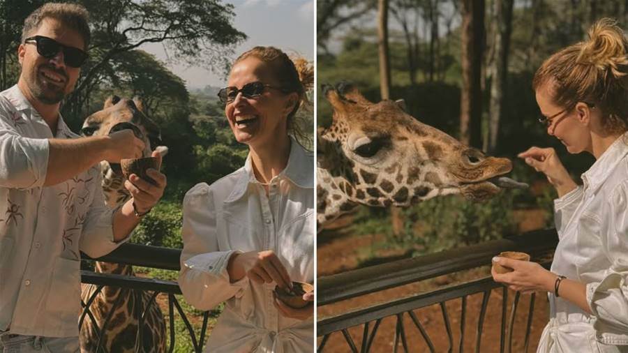 Cristina não poderia conter sua emoção ao visitar o Giraffe Centre, um lugar emblemático onde os visitantes têm a extraordinária oportunidade de interagir de perto com girafas.