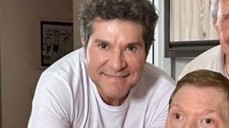 O artista, sorridente, está sentado à mesa e segura a criança. "Tirando um sorriso do biso", escreveu ele.
