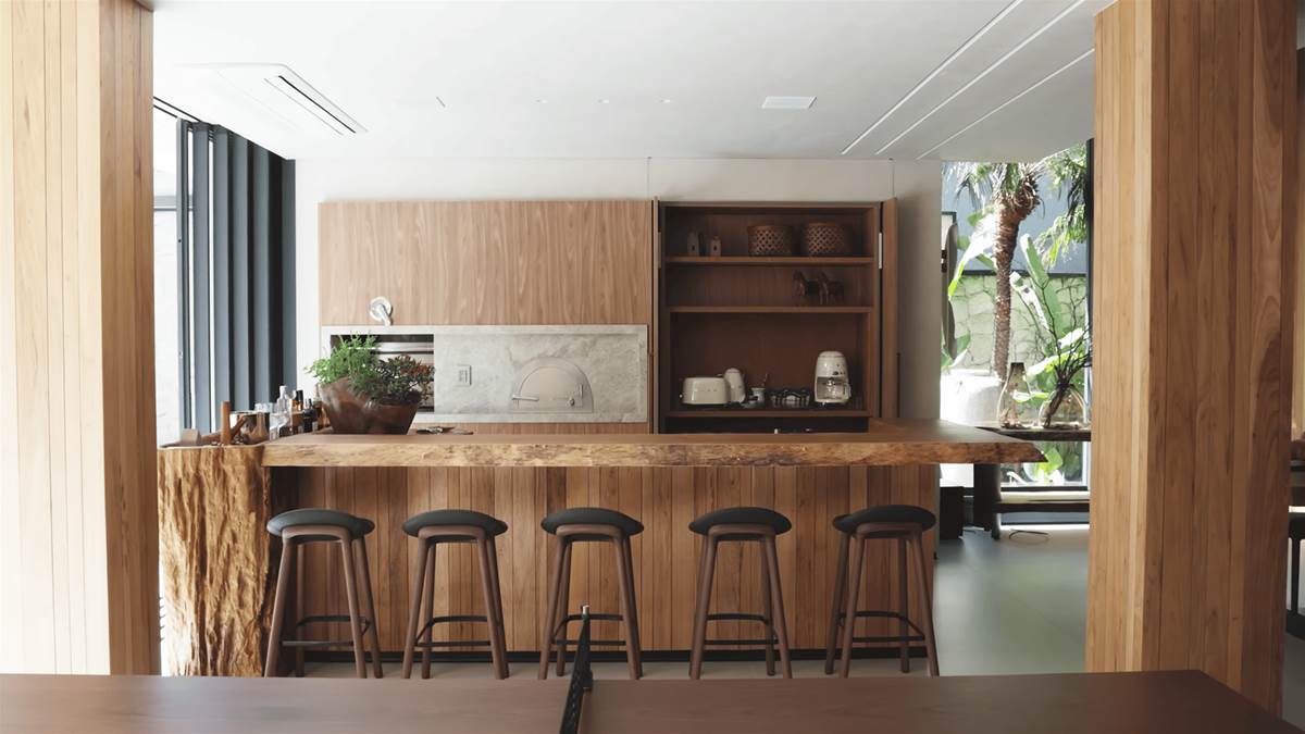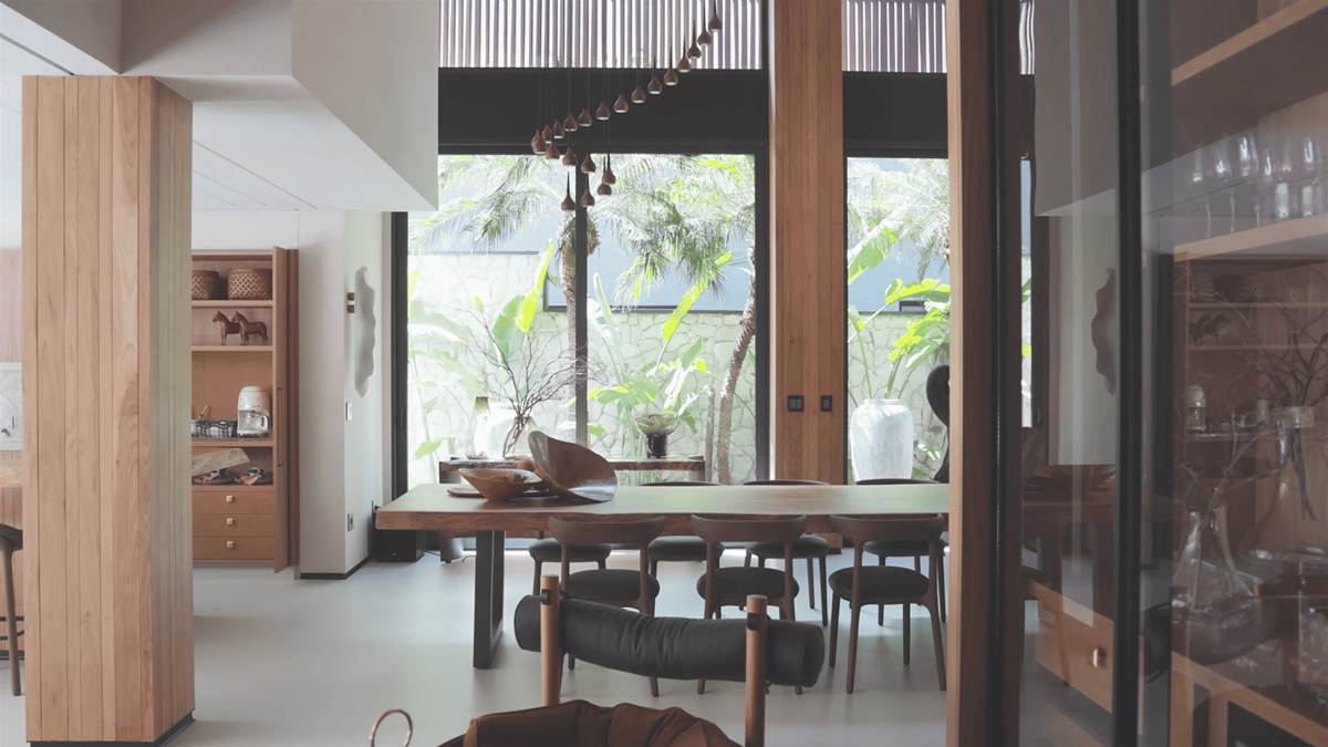 O projeto também inclui uma sala de banho com clima de spa, piscina equipada com telão e até um palco instalado para receber amigos e celebrar momentos especiais.