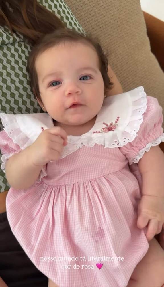 Nos Stories, a influenciadora digital e ex-BBB surgiu com a herdeira no colo. A menina acabou roubando a cena ao surgir usando um lindo vestido rosa com detalhes brancos.