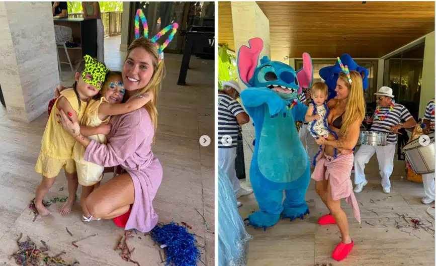 É Carnaval no Brasil mesmo!" As imagens compartilhadas mostram as crianças mergulhadas no clima carnavalesco, com os rostinhos pintados, máscaras coloridas e muita animação. As meninas, conhecidas carinhosamente como "as Marias", e o pequeno José Leonardo, de apenas um ano, se divertiram sem parar, esbanjando alegria nos cliques.