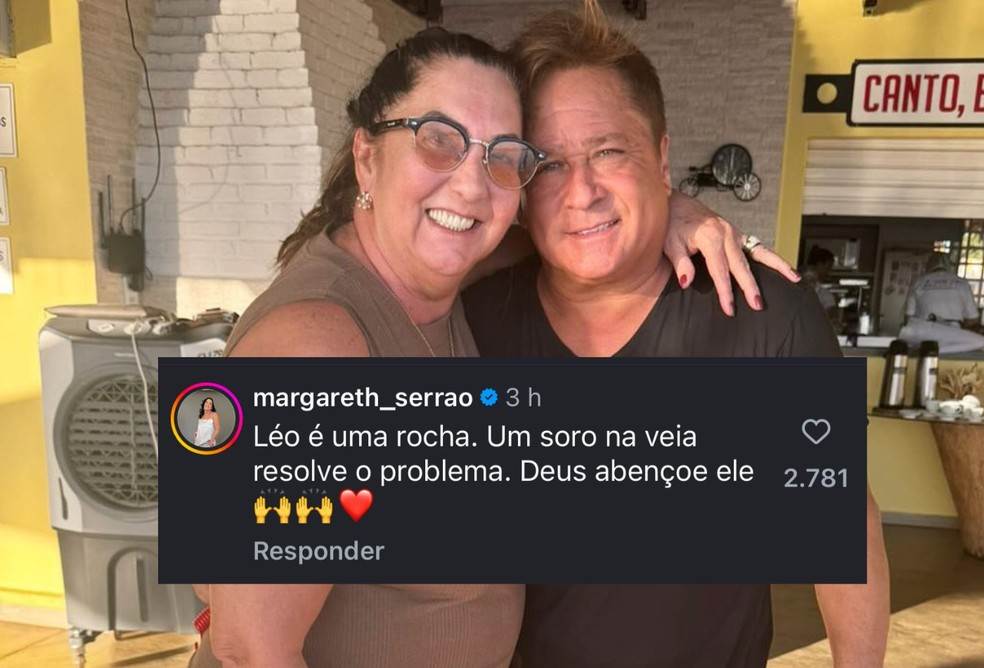 "Léo é uma rocha. Um soro na veia resolve o problema. Deus abençoe ele", escreveu a ex-sogra de Zé Felipe em uma publicação no Instagram sobre a saúde de Leonardo.