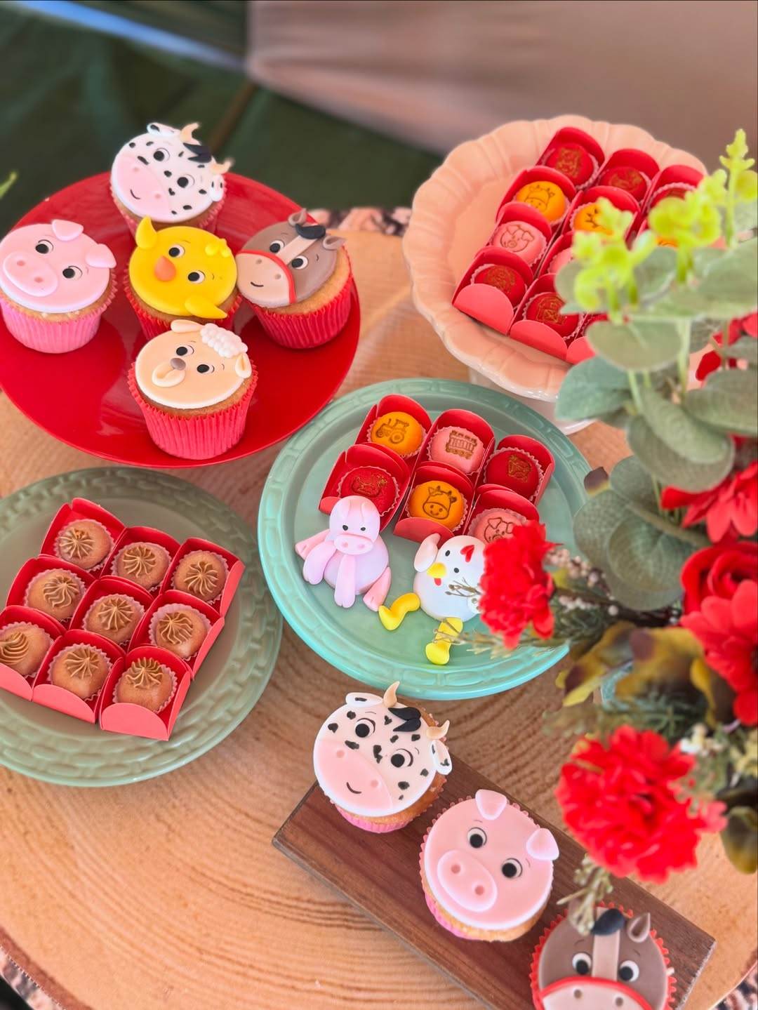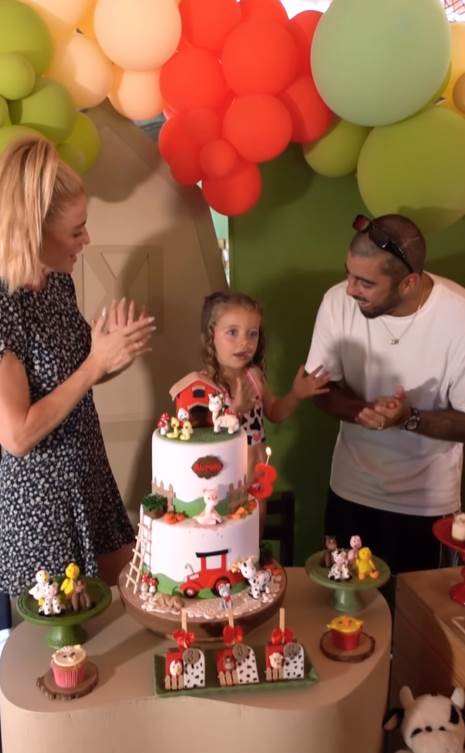 Também teve brinquedos e um local para as crianças se divertirem na água. A decoração contou com muitas bexigas coloridas, animais, objetos e veículos de fazenda. A festa contou com doces personalizados e um bolo de três andares, decorados conforme o tema.