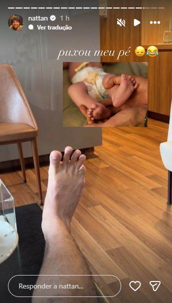 Em seus stories, o artista mostrou uma imagem do próprio pé ao lado do pezinho da recém-nascida e brincou com a semelhança física: "Puxou meu pé".