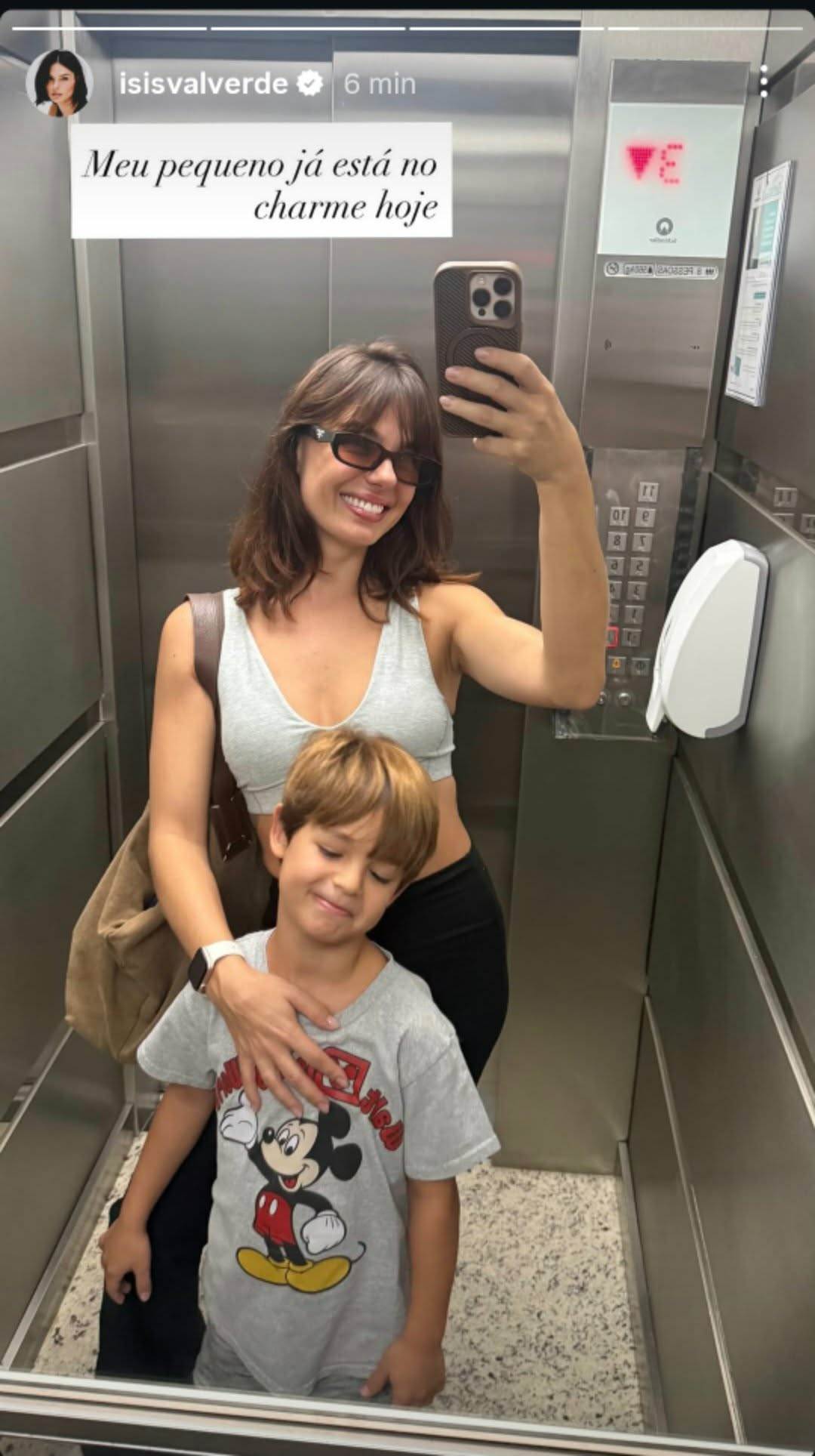 "Meu pequeno já está no charme hoje", postou a artista a foto que tirou com ele no espelho do elevador a caminho de um compromisso.