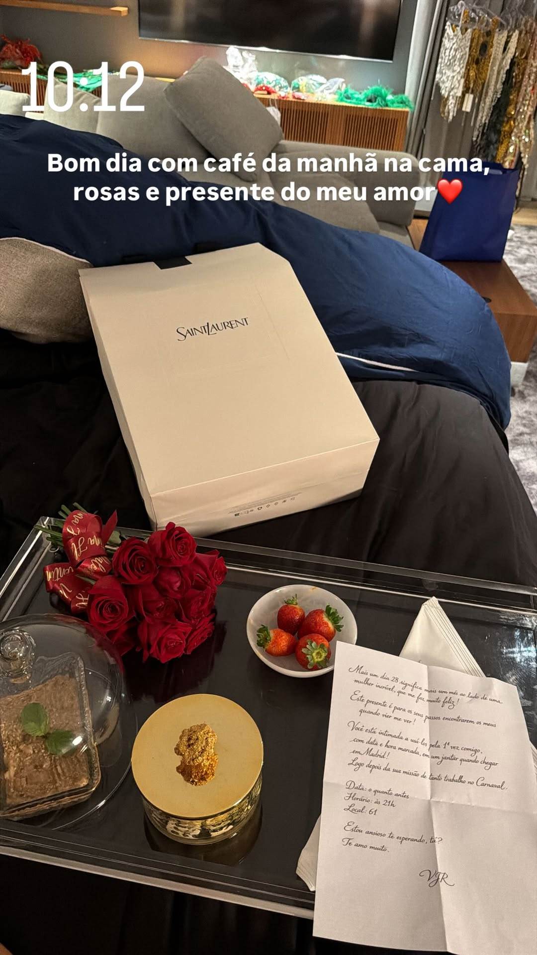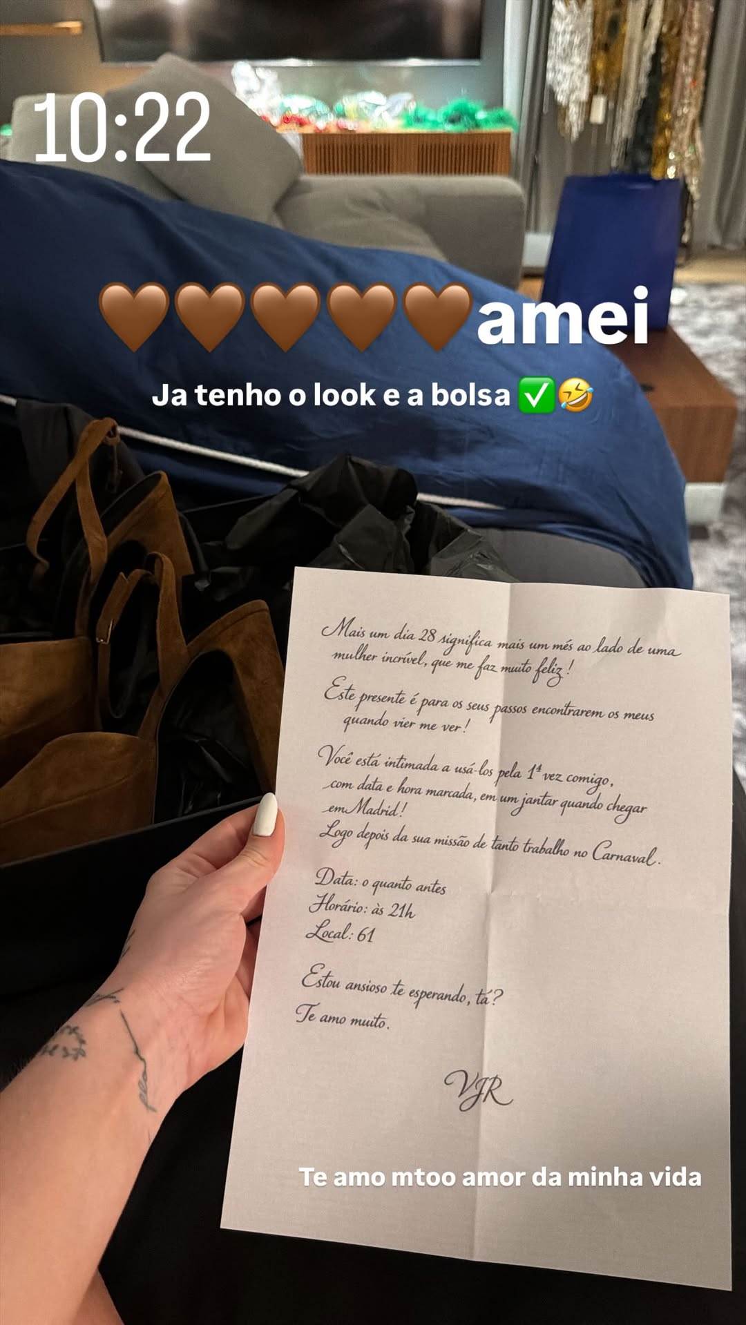 "Você está intimada a usá-los pela primeira vez comigo, com data e hora marcada, em um jantar quando chegar em Madrid! Logo depois de sua missão de tanto trabalho no Carnaval", falou ele mostrando seu lado romântico e decidido.
