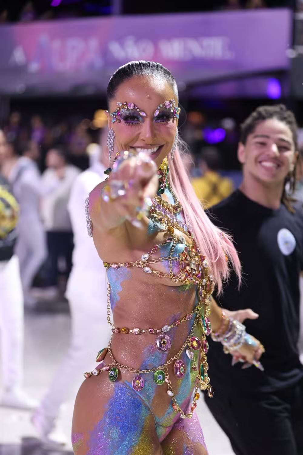 Para o look, a Rainha de Bateria apostou em um look cravejado de cristais, assinado pela Swarovski, com cerca de 3 mil cristais vindos da Áustria. O visual chamou atenção pelo brilho intenso e pela riqueza de detalhes, representando a fantasia Aquarela de Heitor dos Prazeres para a Vila Isabel, que neste ano apresenta o enredo Macumbembê, Samborembá: Sonhei que um Sambista Sonhou a África, celebrando o legado do multiartista Heitor dos Prazeres e a ancestralidade africana no samba carioca.