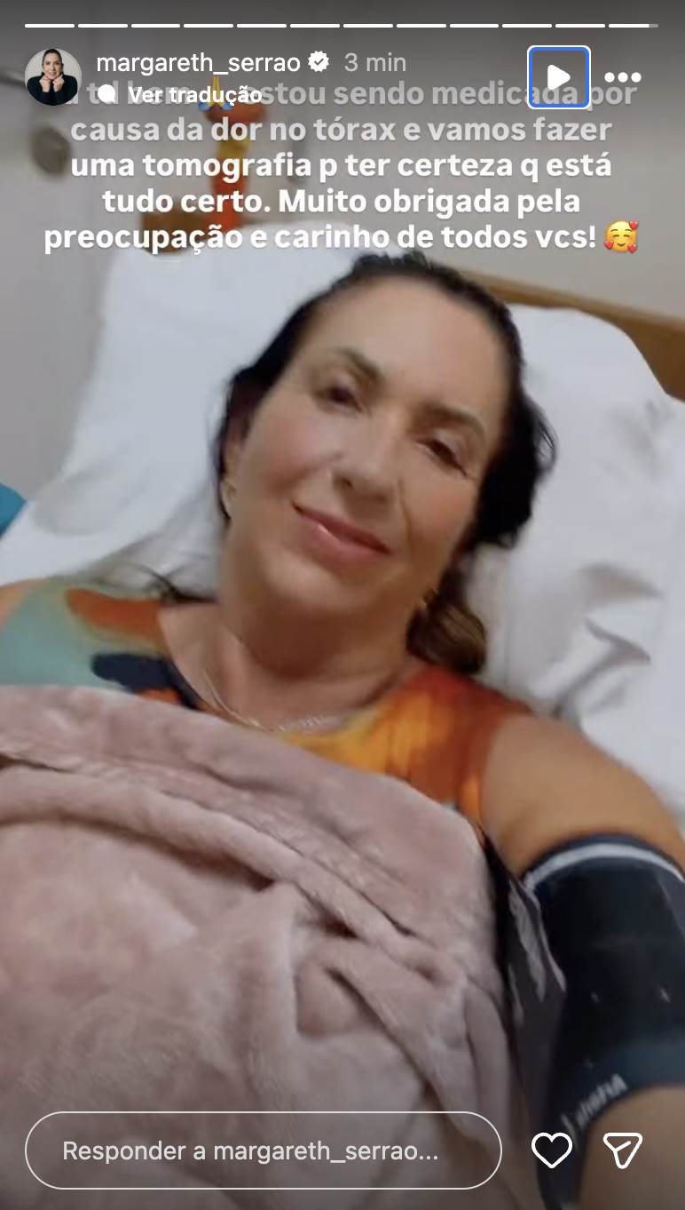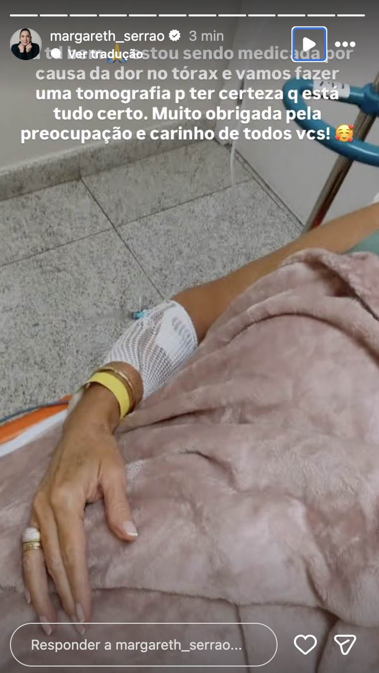 Na tarde desta terça-feira, 20, Margareth reapareceu nas redes sociais para exibir uma imagem deitada na maca e recebendo medicação intravenosa.
