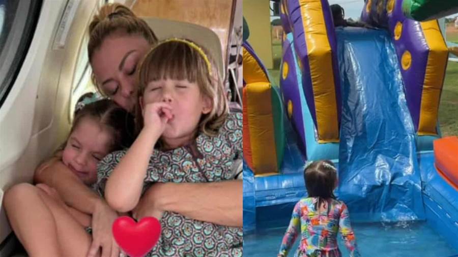Além de postar um registro em um jatinho particular com Maria Alice e Maria Flor, Poliana mostrou as pequenas se divertindo em brinquedos infláveis. Nas primeiras imagens, as herdeiras de Virginia e Zé Felipe aparecem brincando em um escorregador com piscina, depois, elas estão se divertindo em uma cama elástica.
