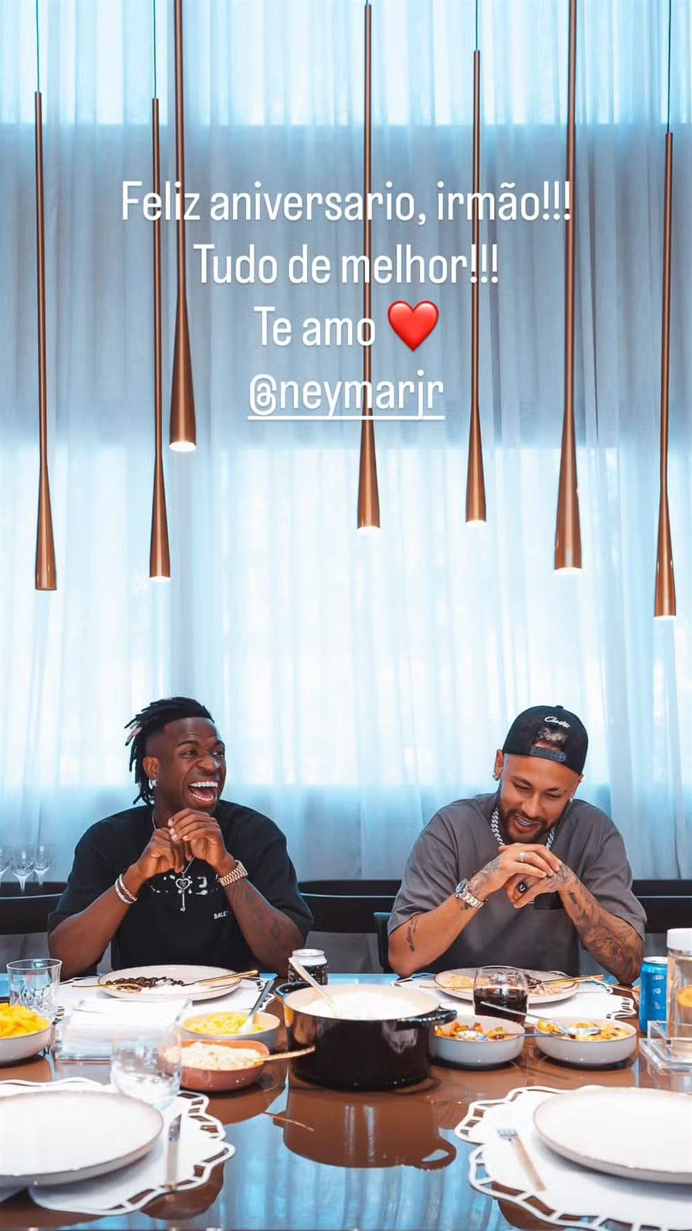 Vini Jr, de 25 anos, usou as redes sociais nesta quinta-feira (5) para homenagear Neymar pelo aniversário de 34 anos. “Feliz aniversário, irmão. Tudo de melhor. Te amo”, escreveu o jogador ao compartilhar uma foto em que aparece ao lado do craque do Santos em um momento espontâneo de descontração e diversão.