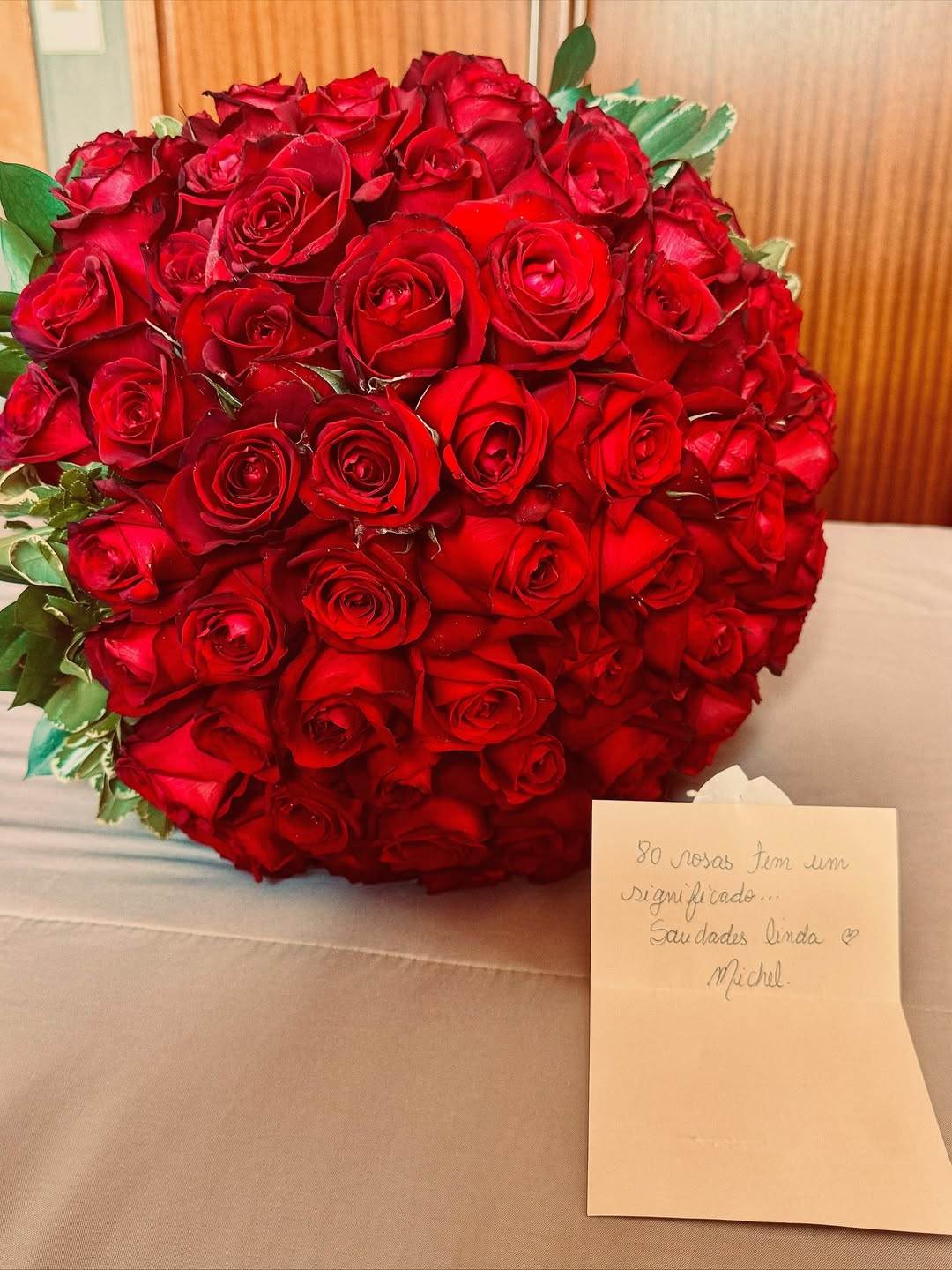 Mesmo assim, um detalhe acabou chamando atenção: ao mostrar um buquê de 80 rosas recebido em comemoração aos 80 dias de namoro, ela exibiu o bilhete assinado por "Michel".