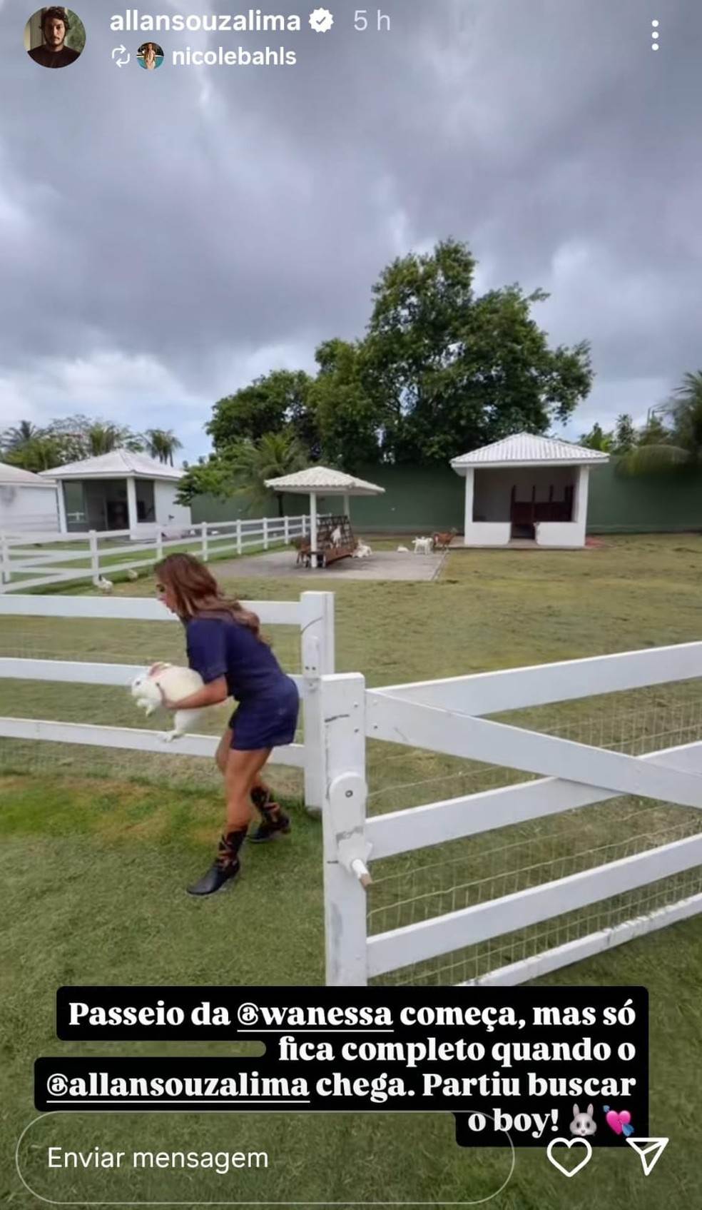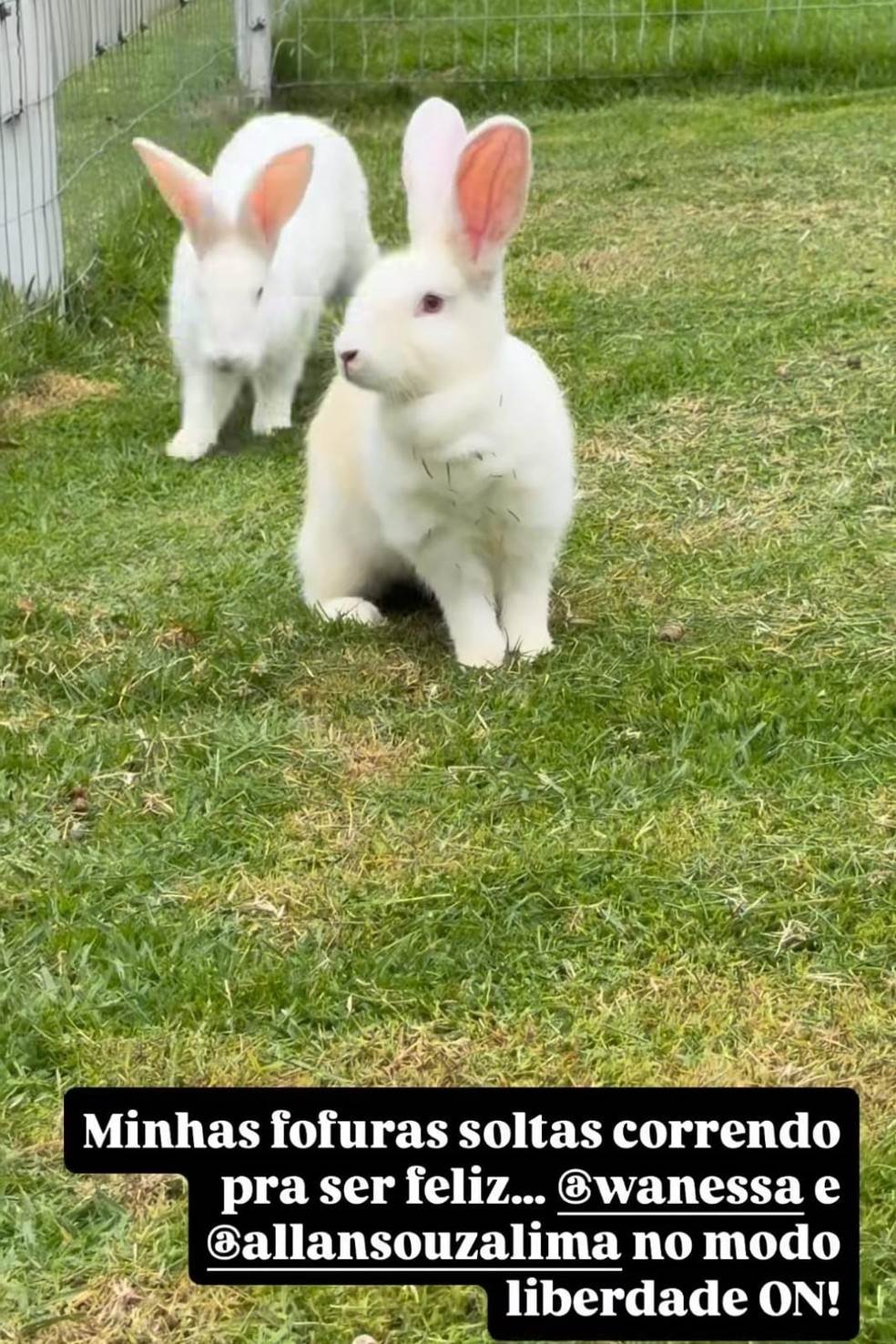 Partiu buscar o boy", disse ela, mostrando os bichos soltos no gramado, correndo ao som dos hits O amor não deixa. "Minhas fofuras soltas, correndo para ser feliz... Wanessa e Allan no modo liberdade on", continuou.