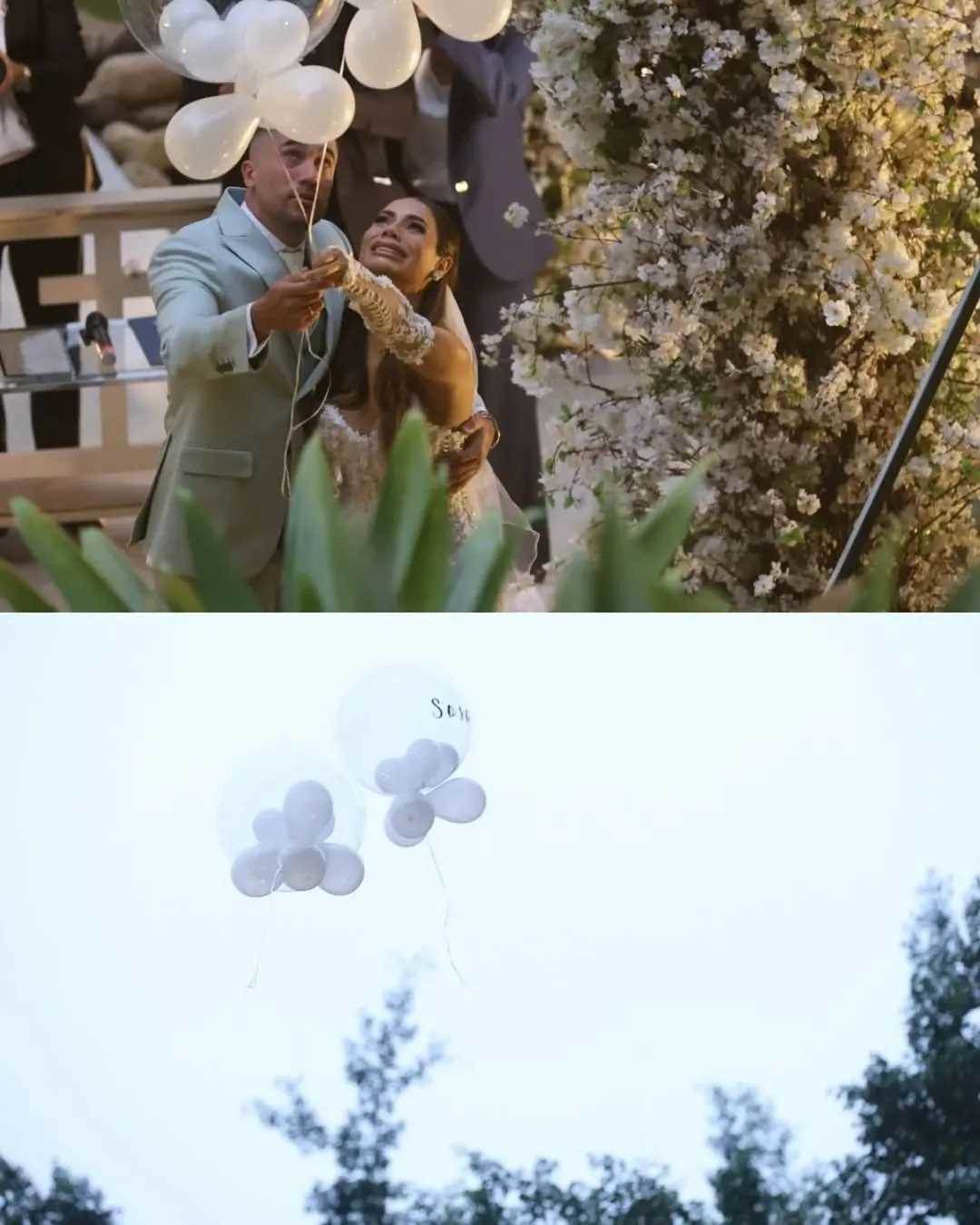 Lexa e Ricardo prepararam bexigas brancas com o nome da filha, que eles soltaram no ar.