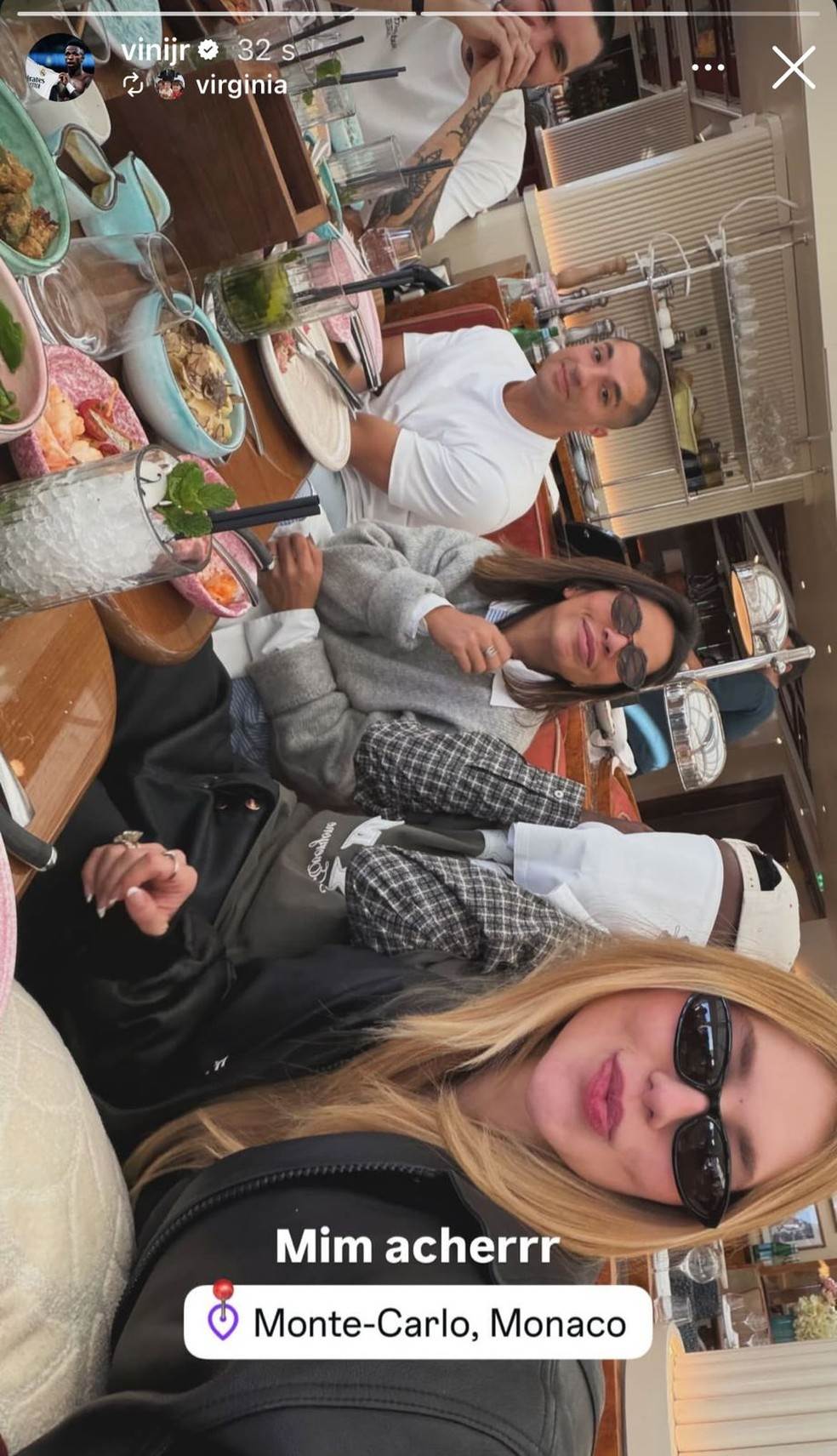 Virginia Fonseca, de 26 anos, postou uma foto nesta segunda-feira (27) em um restaurante em Monte Carlo, em Monaco. Vini Jr., de 25, aparece ao lado dela, mas um detalhe roubou a cena: ele está escondendo o rosto com um guardanapo de pano. O jogador de futebol, no entanto, parece ter feito isso na brincadeira, pois repostou a foto em suas redes sociais, mostrando que não quer mais esconder o romance.