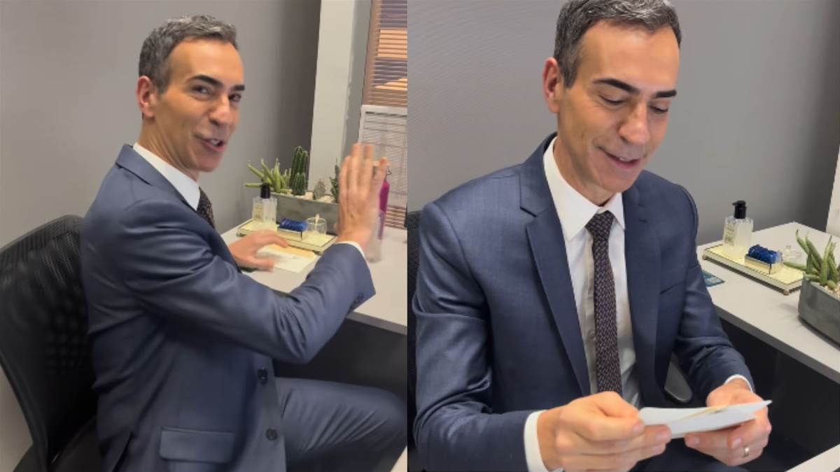"Meu novo cantinho… na firma! Renata e equipe me receberam com todo carinho e afeto. Sou muito grato, muito mesmo à toda essa energia boa e poderosa", escreveu César Tralli em sua publicação.
