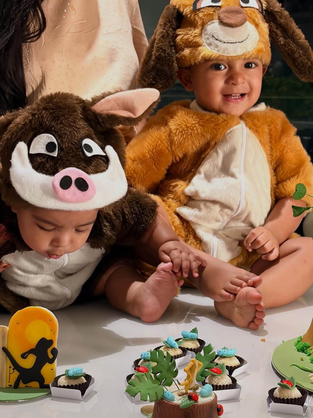 Além de mostrar o bolo e os doces personalizados, a influenciadora digital encantou ao mostrar que fantasiou o caçula de Pumba e o primogênito, Jorge, de dois anos, de Timão.