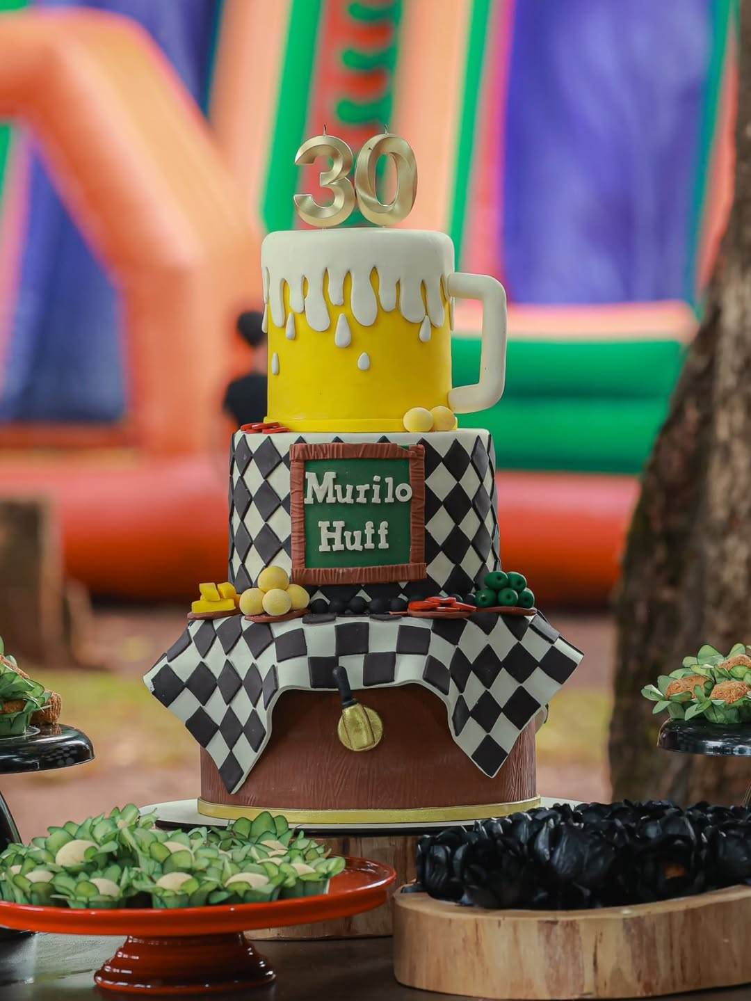 Nos vídeos, Léo aparece sorridente, no colo de Gabriela, enquanto os convidados cantam "Parabéns pra você". O bolo, temático de boteco, trazia detalhes inspirados em petiscos e uma caneca de chope como decoração.