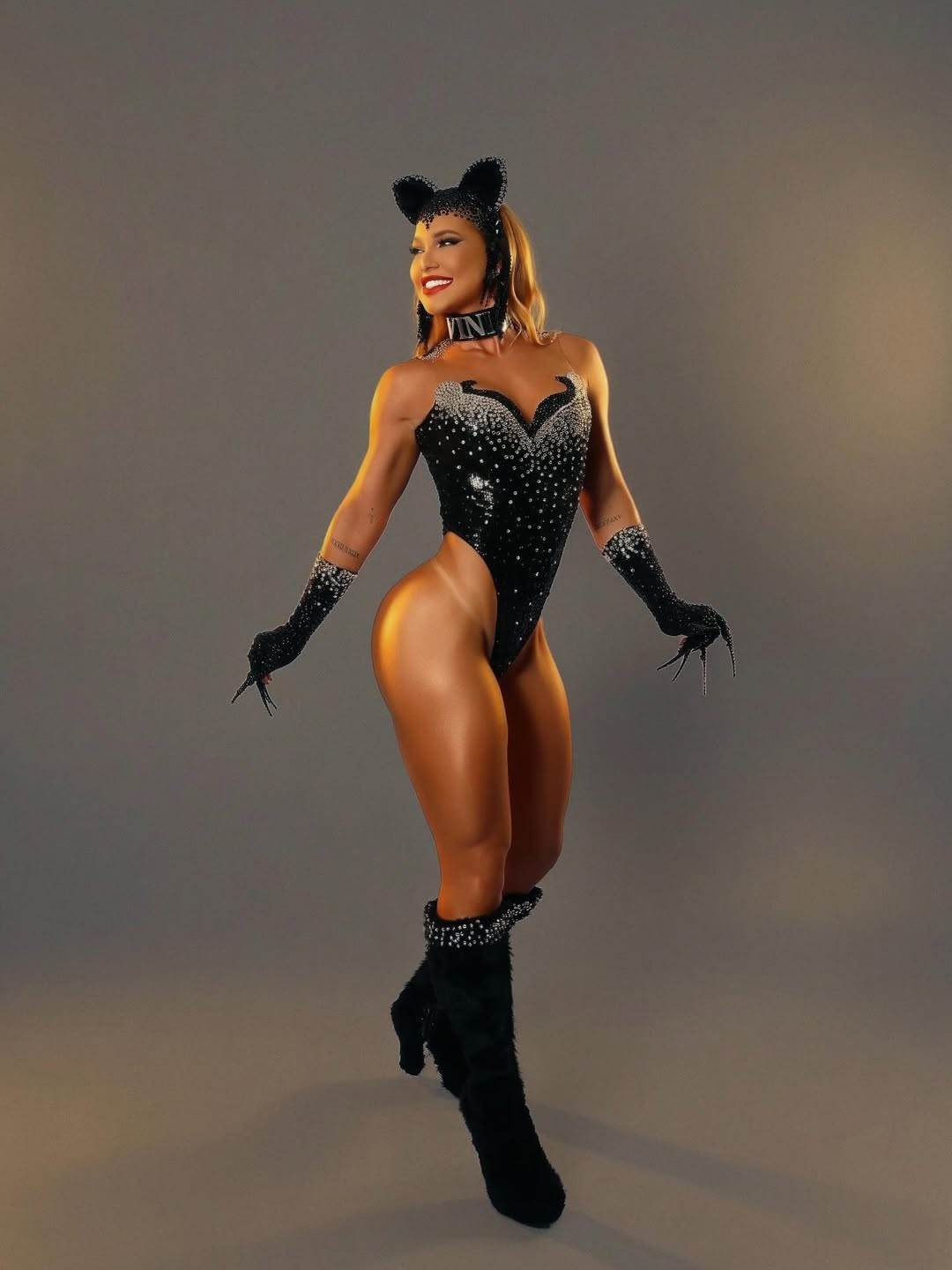 Inspirada no desfile de 1998, quando Luma apareceu como onça-preta usando uma coleira com o nome do então marido, Eike Batista, Virginia adotou um visual semelhante e usou uma coleira com o nome do namorado, o jogador Vini Jr., de 25 anos.