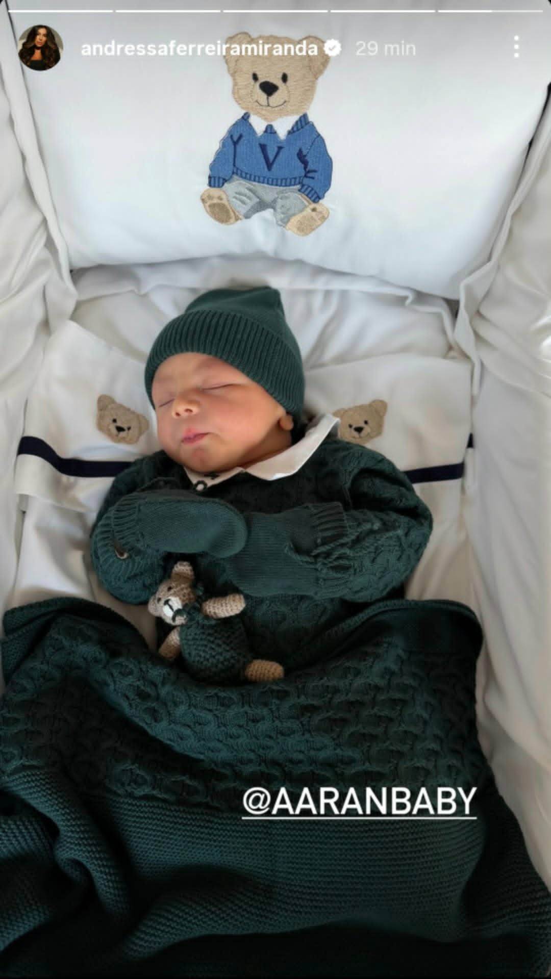 Em outro momento, a influencer exibiu o bebê arrumadinho com um look verde dormindo.