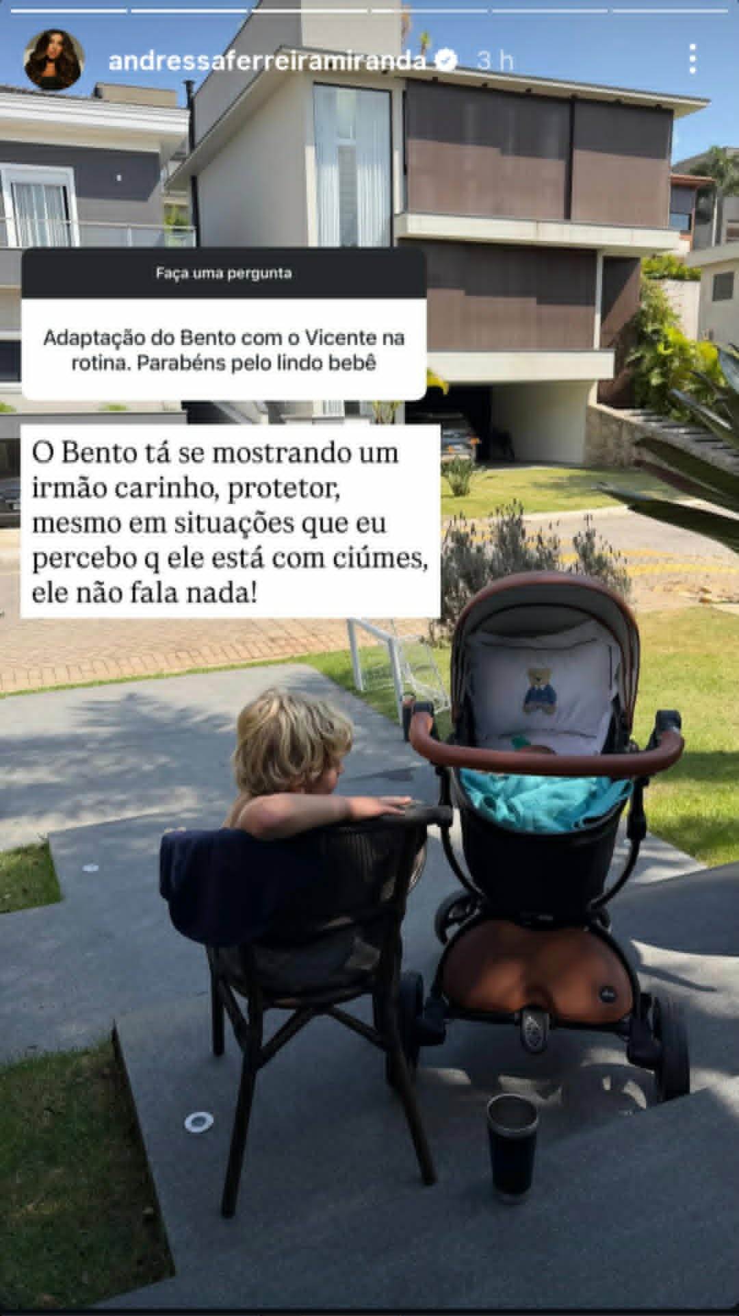 Até então herdeiro único, o menino agora está se acostumando com a novidade e a mãe contou como está sendo. Em seus stories, ela respondeu a uma pergunta sobre como o mais velho estaria lidando com a presença do bebê.