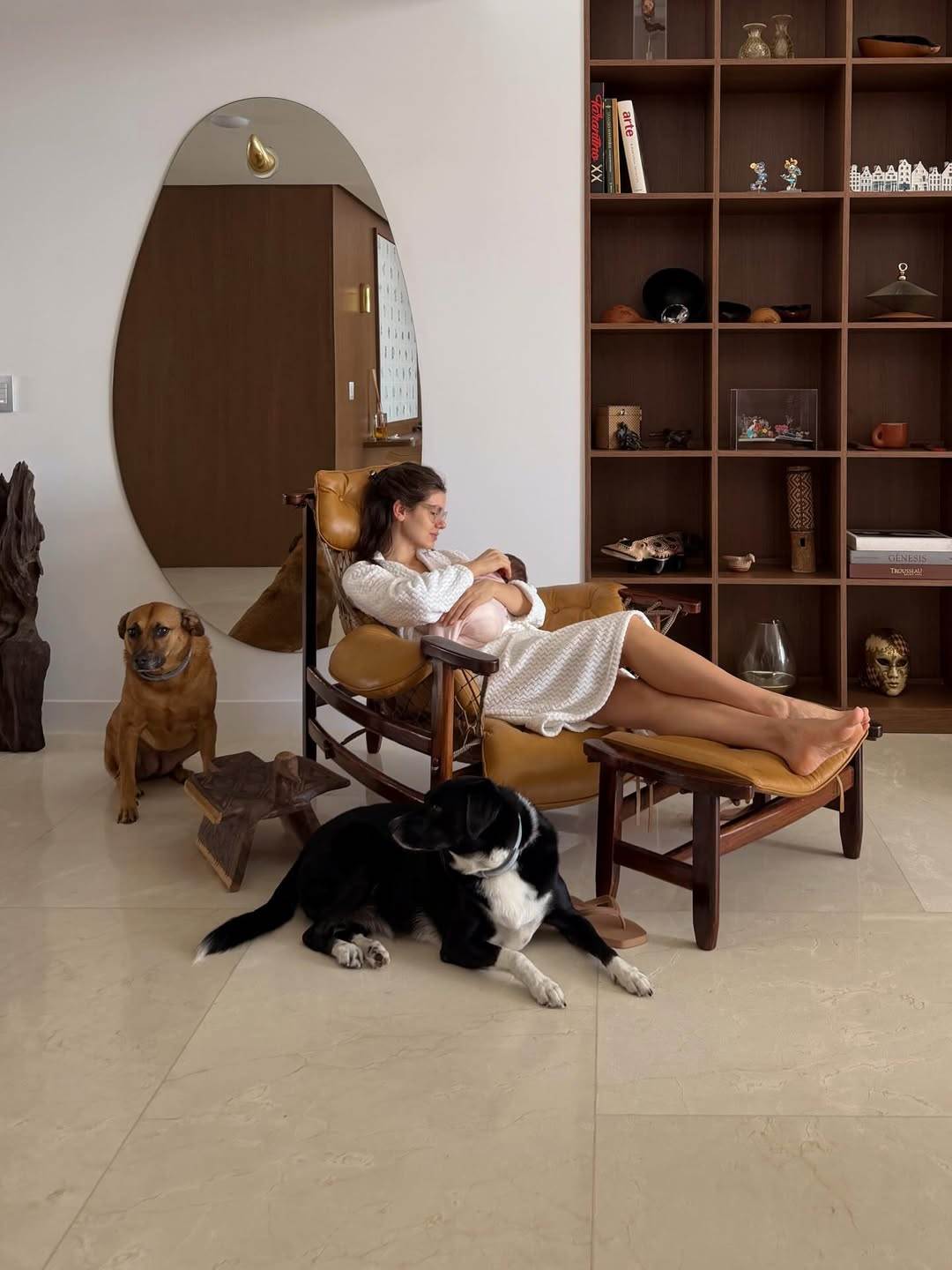 Entre os registros, a atriz posou com a filha no colo, acompanhada pelos cachorros da família, e também ao lado do marido.