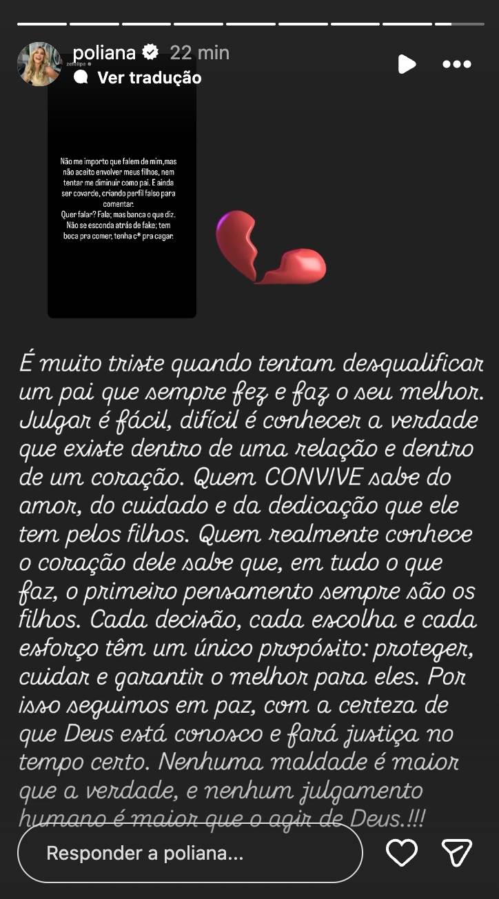 Na noite deste domingo, Poliana destacou o paizão que o filho é para seus filhos e defendeu a postura dele no dia a dia ao contar que o herdeiro sempre faz tudo pensando nas crianças. "É muito triste quando tentam desqualificar um pai que sempre fez e faz o seu melhor. Julgar é fácil, difícil é conhecer a verdade que existe dentro de uma relação e dentro de um coração", disse ela.