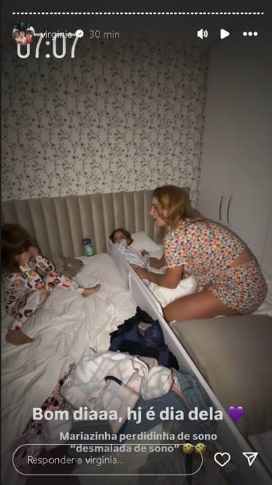 A influenciadora então puxou a caçula para dar um beijo, e a primogênita relembrou: "Lembra que a gente deu os parabéns pra mim?". Virginia respondeu com bom humor: "Aham, hoje é o da irmã". Ao postar o vídeo, Virginia escreveu: "Hoje é dia dela! Mariazinha perdidinha de sono, 'desmaiada de sono' (risos)".