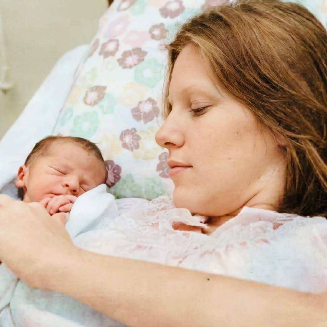 Na foto, a atriz aparece deitada na cama da maternidade com o primogênito em seus braços.