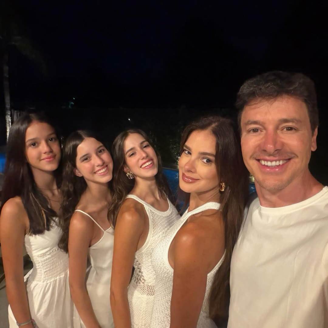 Na foto seguinte, Vera e as herdeiras surgem ao lado de Rodrigo Faro, que optou por utilizar um traje branco e combinar com a família. Eles decidiram passar a data especial em uma casa de praia luxuosa.