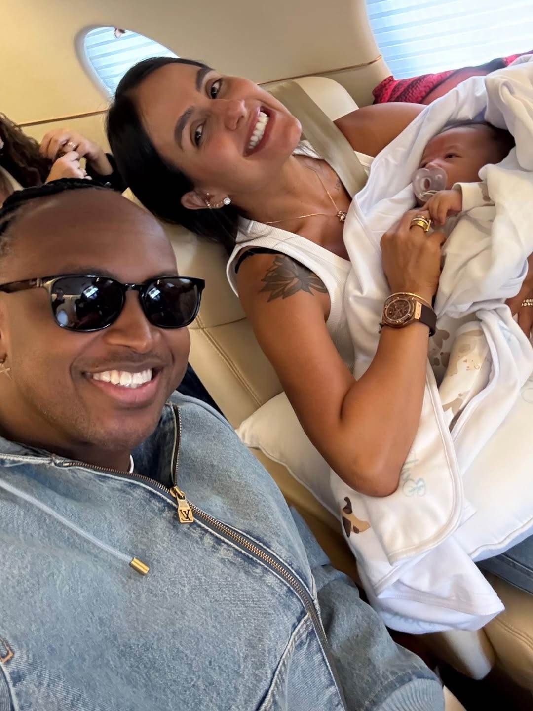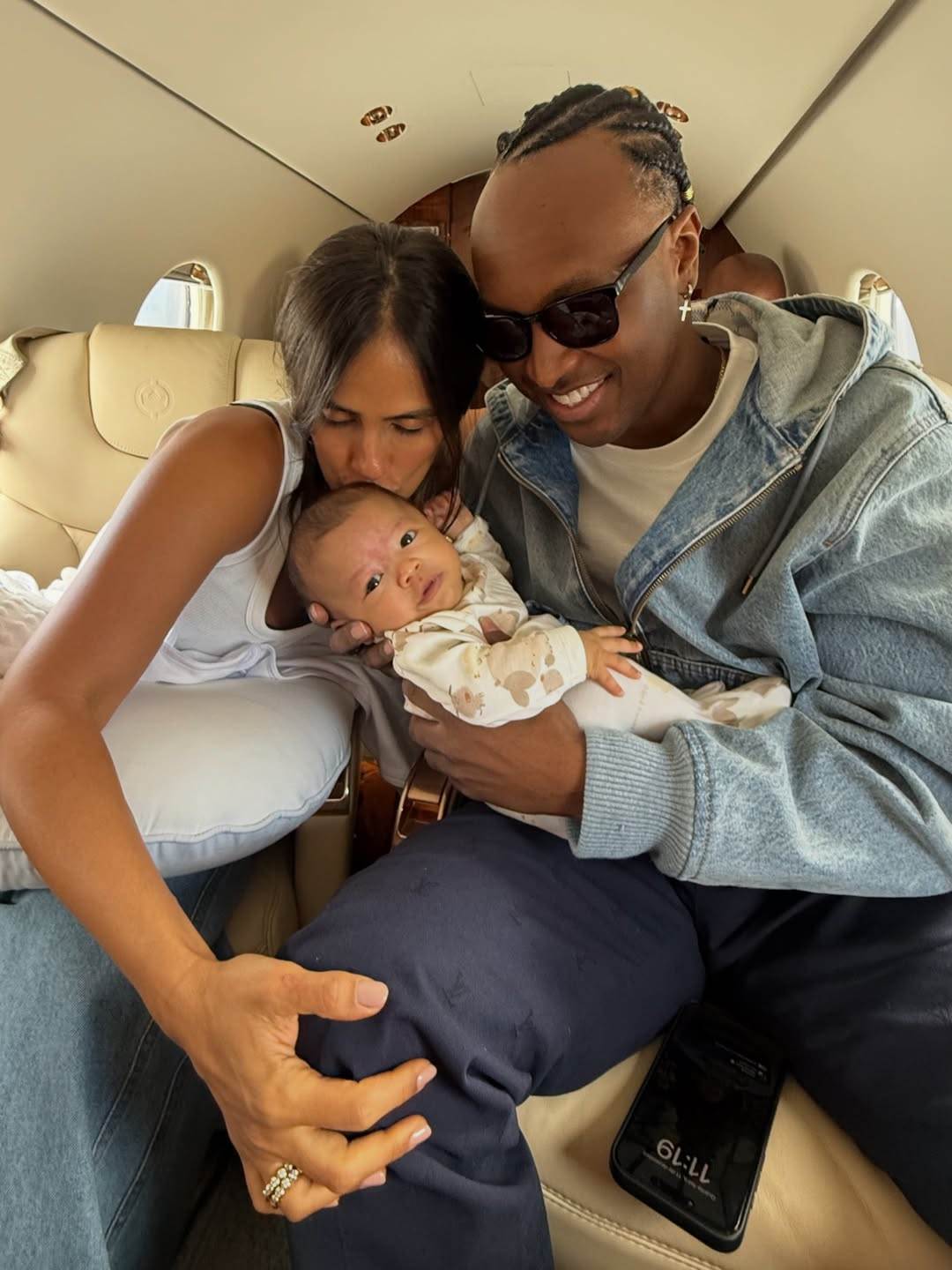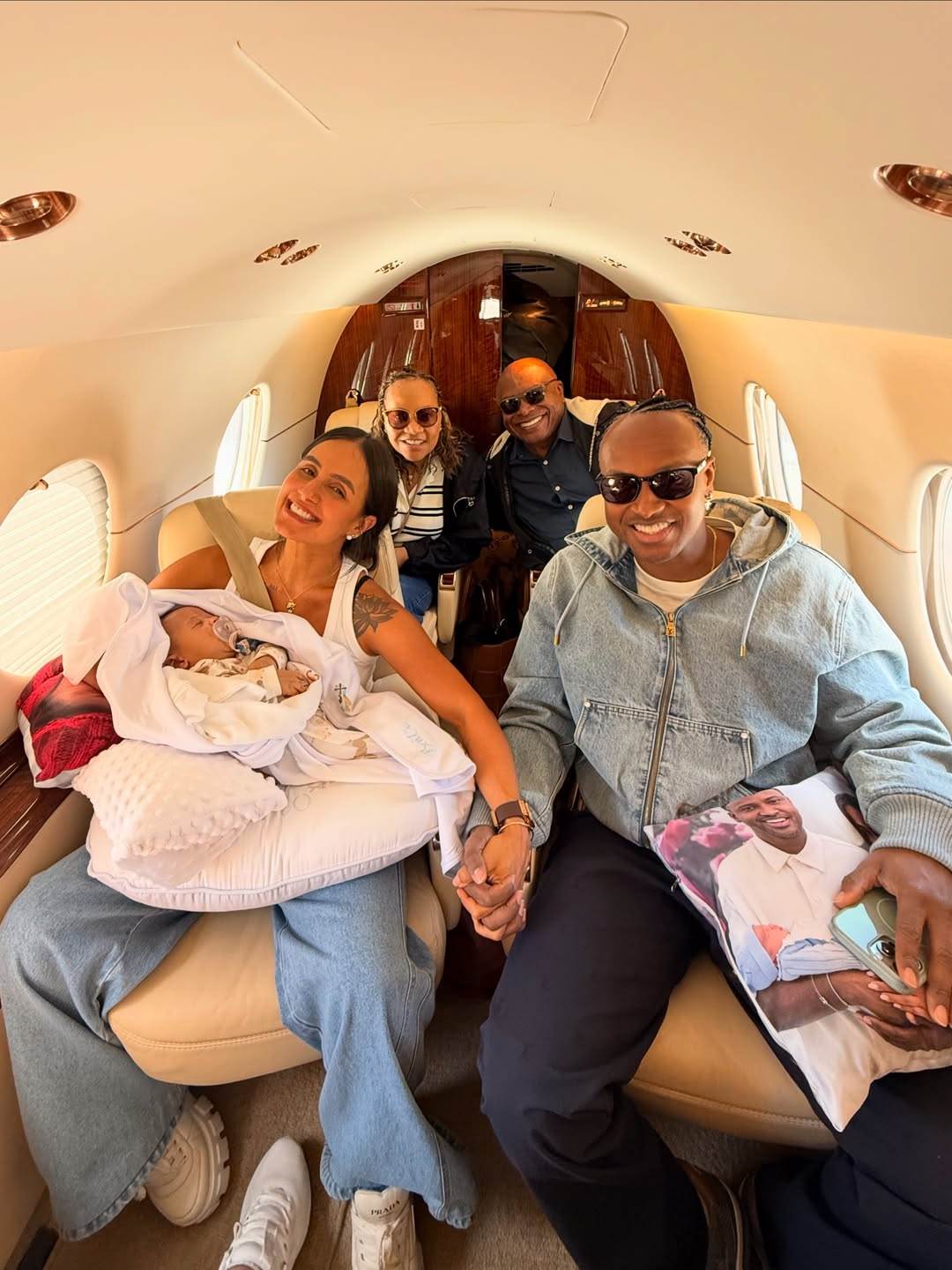 Em um avião particular, eles apareceram sentados e sorridentes enquanto o herdeiro do famoso surgiu dormindo no colo da mãe.