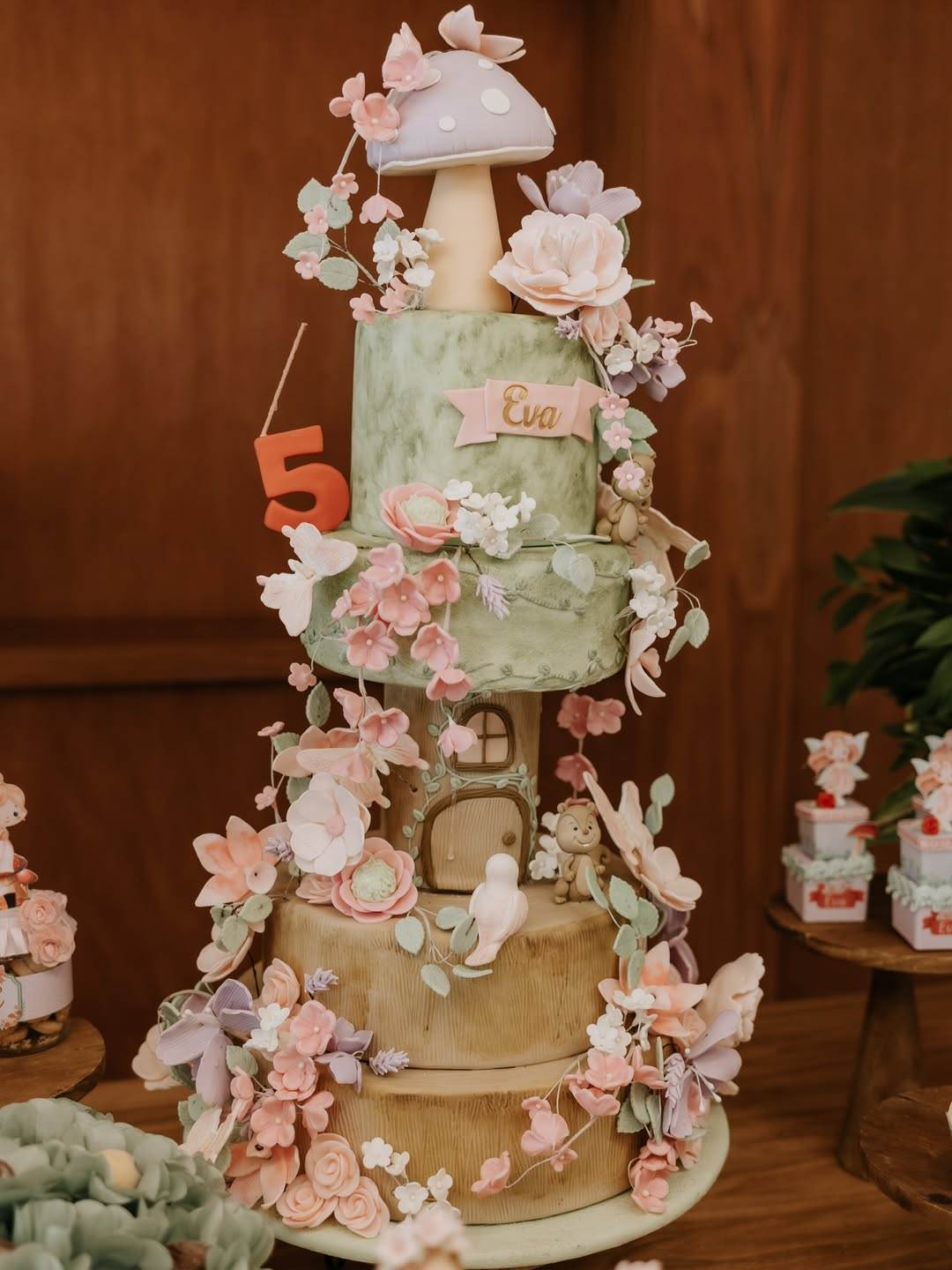 A celebração de Eva ainda teve docinhos personalizados, brincadeiras para as crianças e um bolo com cinco andares decorado com elementos que remetem à floresta, como flores e pássaros.