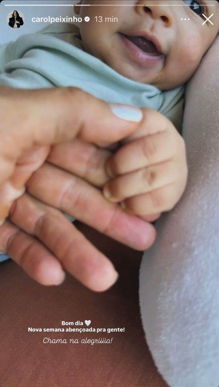 O filho dos famosos ainda aparece segurando a mão de Carol Peixinho. A influenciadora, por sua vez, desejou um bom início de semana ao público que a acompanha: "Bom dia. Nova semana abençoada para gente! Chama na alegria!", escreveu ela na legenda.